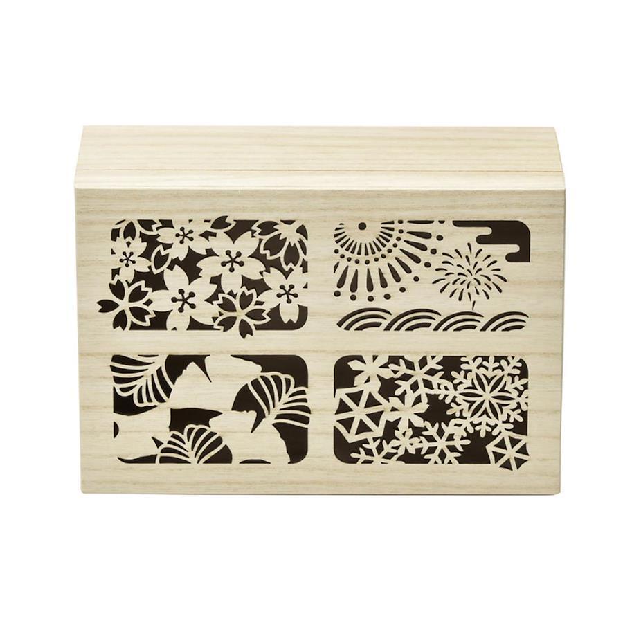 The set comes in a charming Wooden Gift Box with decorative laser-cut patterns representing the four Japanese seasons (Sakura/Cherry Blossom, Fireworks/Waves, Autumn Leaves, and Snowflakes).