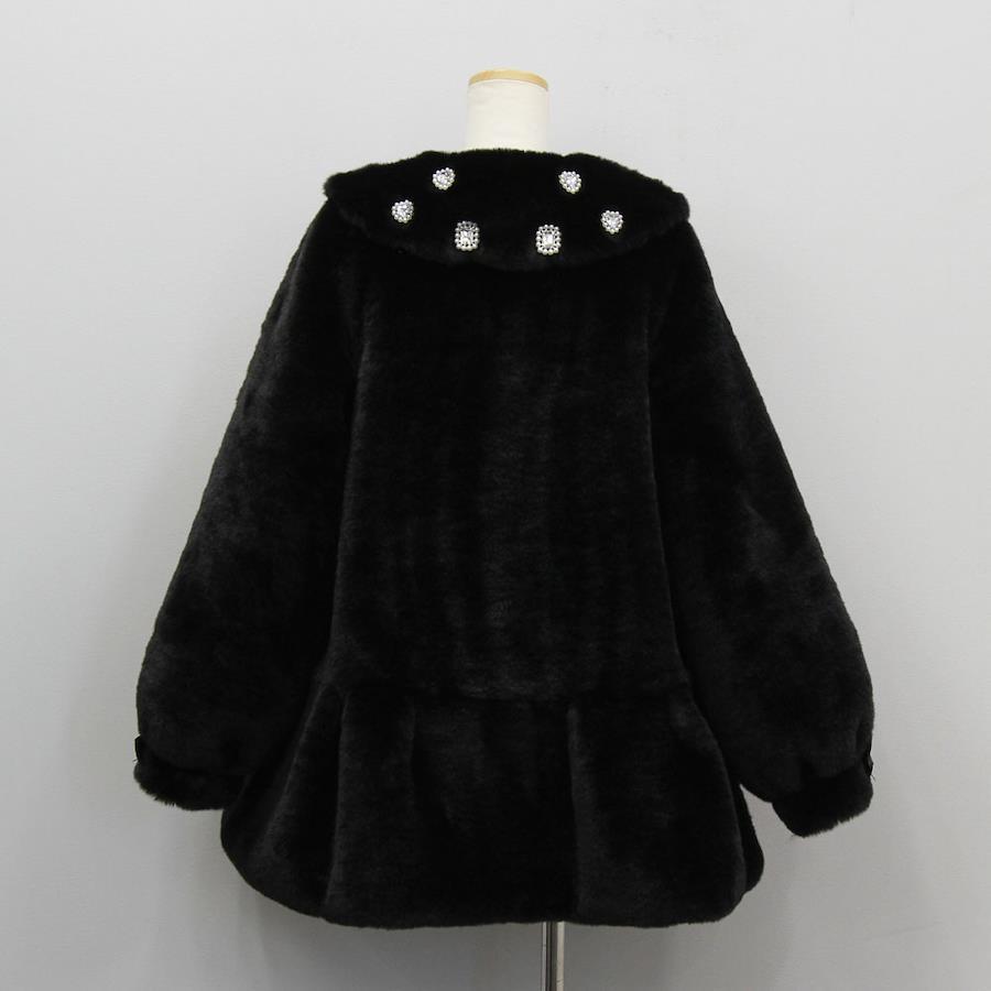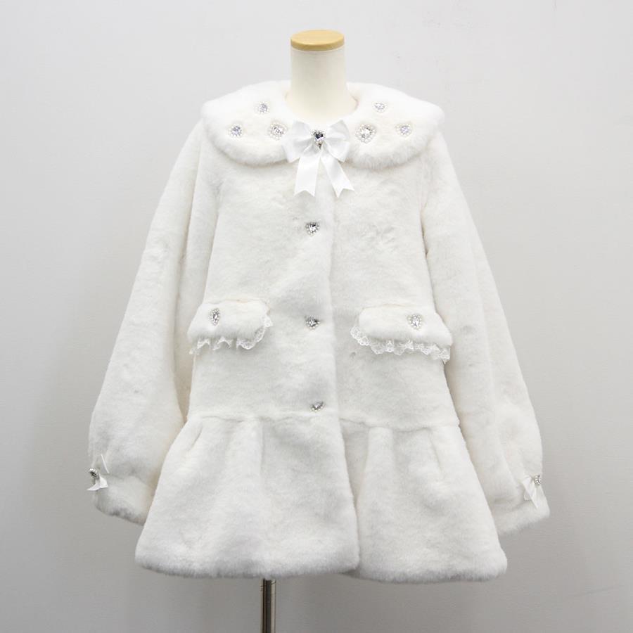 キラキラビジューが散りばめられたふわふわのかわいいファーコート【デザイン】襟元の大きめキラキラビジューが散りばめられたかわいいファーコートです♪ボタンにもかわいいハートパールビジューがポイントに♪ボタンはスナップボタンで楽ちんに着脱できます。ふわっとひろがるデザインでどんなお洋服にも合わせられるコートです。【素材】ファー素材を使用しています。裏地は中綿キルティング仕様になっています。【コーディネート】量産型コーデや甘めロリータ系コーデにぴったりのファーコートです。おもわず抱きしめたくなるくらいかわいいボリューム感がたまらない♪《透け感》なし 《生地の厚さ》厚手 《裏地》あり 《伸縮性》なし《生産国》中国
