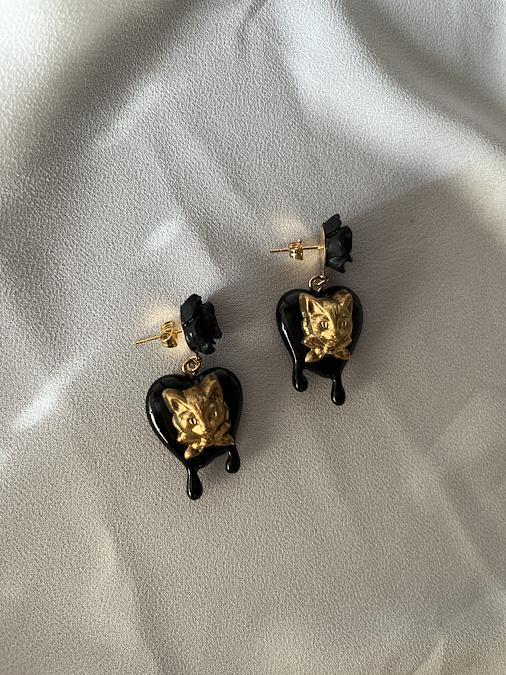 猫と薔薇というモチーフを、黒とゴールドのツートンカラーで作ることで落ち着いた雰囲気に仕上げました。シックなワンピースはもちろん、フリルを施したブラウスなどにもお似合いです。