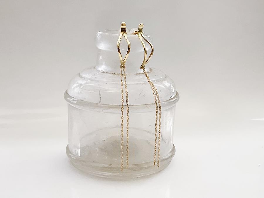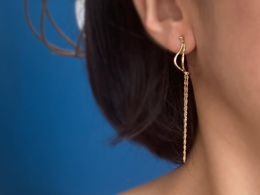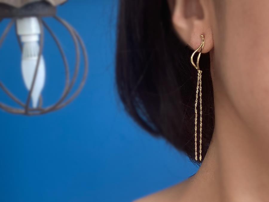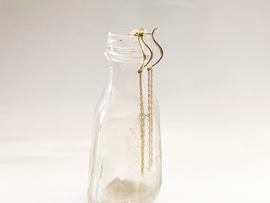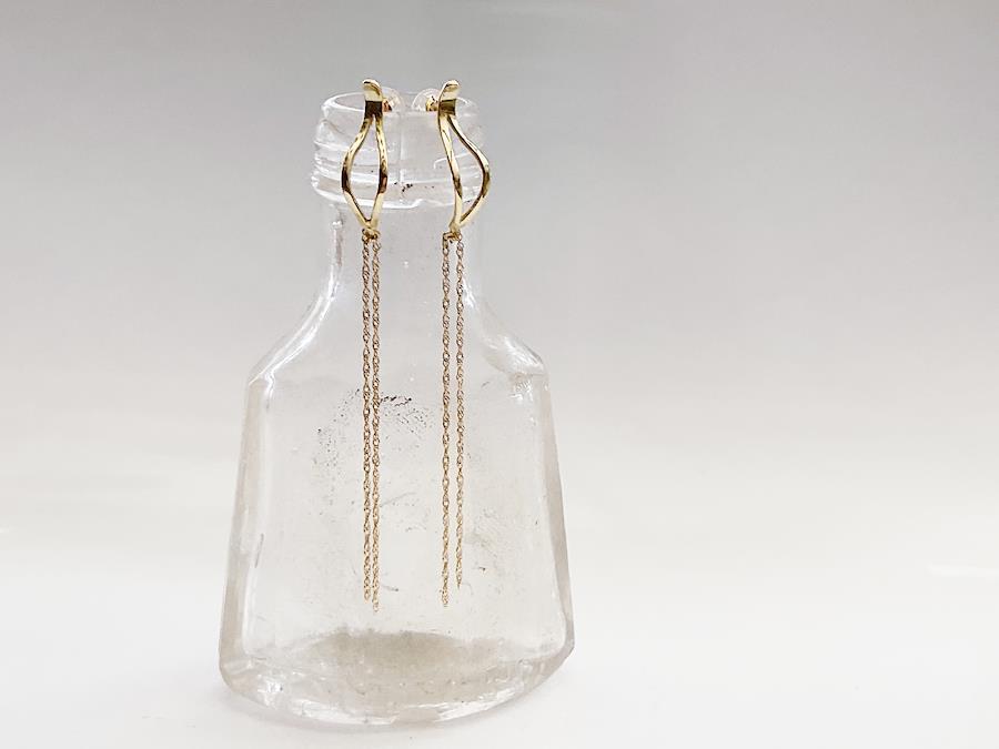 S字のふたまたパーツの立体感と光と影、直線的に揺れるチェーン、目線が楽しいロングピアスです。