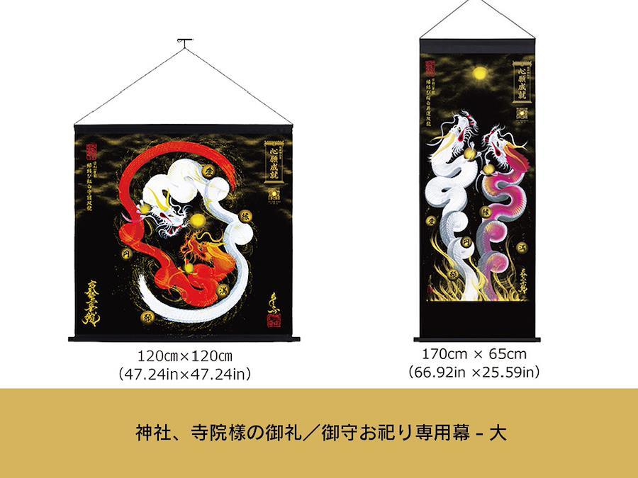 【商品の特徴】・京都一筆龍描画の種類/色彩は【26種】よりお選びいただけます<昇運龍14種(双龍5種/1体龍9種)> <守護龍10種(双龍2種/1体龍8種)> <縁結び龍2種(双龍2種)>・『京都一筆龍の御加護/御利益の象徴=胴体部分を一切途切れさせず一筆で描く動画』のQRコード印字ステッカー(2色/4サイズ)を同封お納めいたしております・描画に記載可能なお願い事は6種のご祈願内容より御選定いただけます心願成就/事業繁栄/金運上昇/健康祈願/家内安全/良縁成就・御札など添付のお祀り用マグネットを使用してお祀り(取り外し/位置変更可能)・発色が良く落ち着いた風合いの防炎スエード生地製(厚み約0.35~ ※官製郵便はがき約1.5枚程度/コピー用紙約4枚分程度)※ スエードは皮革・合成皮革ではなく専用布の名称となります。・吊り下げ用の上下軸棒付き(下部は軸先付き)※軸棒を外して飾られる場合でも、紐や止め具(画鋲、釘、ネジ等)をお使いいただけるハトメ穴付き(表面からは見えません)・丈夫で切れにくくシンプルな風合いの江戸打ち紐付き(黒/白2色)・龍の眼に光を宿し生気を吹き込む『龍の瞳(ラインストーン)』加工・京都一筆龍絵師手島啓輔署名、落款入り・御贈答のご利用も多く、懇切丁寧な包装