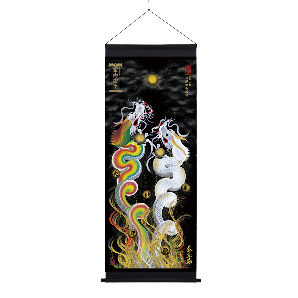【商品の特徴】・京都一筆龍描画の種類/色彩は【26種】よりお選びいただけます<昇運龍14種(双龍5種/1体龍9種)> <守護龍10種(双龍2種/1体龍8種)> <縁結び龍2種(双龍2種)>・『京都一筆龍の御加護/御利益の象徴=胴体部分を一切途切れさせず一筆で描く動画』のQRコード印字ステッカー(2色/4サイズ)を同封お納めいたしております・描画に記載可能なお願い事は6種のご祈願内容より御選定いただけます心願成就/事業繁栄/金運上昇/健康祈願/家内安全/良縁成就・御札など添付のお祀り用マグネットを使用してお祀り(取り外し/位置変更可能)・発色が良く落ち着いた風合いの防炎スエード生地製(厚み約0.35~ ※官製郵便はがき約1.5枚程度/コピー用紙約4枚分程度)※ スエードは皮革・合成皮革ではなく専用布の名称となります。・吊り下げ用の上下軸棒付き(下部は軸先付き)※軸棒を外して飾られる場合でも、紐や止め具(画鋲、釘、ネジ等)をお使いいただけるハトメ穴付き(表面からは見えません)・丈夫で切れにくくシンプルな風合いの江戸打ち紐付き(黒/白2色)・龍の眼に光を宿し生気を吹き込む『龍の瞳(ラインストーン)』加工・京都一筆龍絵師手島啓輔署名、落款入り・御贈答のご利用も多く、懇切丁寧な包装