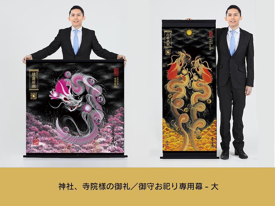 【商品の特徴】・京都一筆龍描画の種類/色彩は【26種】よりお選びいただけます<昇運龍14種(双龍5種/1体龍9種)> <守護龍10種(双龍2種/1体龍8種)> <縁結び龍2種(双龍2種)>・『京都一筆龍の御加護/御利益の象徴=胴体部分を一切途切れさせず一筆で描く動画』のQRコード印字ステッカー(2色/4サイズ)を同封お納めいたしております・描画に記載可能なお願い事は6種のご祈願内容より御選定いただけます心願成就/事業繁栄/金運上昇/健康祈願/家内安全/良縁成就・御札など添付のお祀り用マグネットを使用してお祀り(取り外し/位置変更可能)・発色が良く落ち着いた風合いの防炎スエード生地製(厚み約0.35~ ※官製郵便はがき約1.5枚程度/コピー用紙約4枚分程度)※ スエードは皮革・合成皮革ではなく専用布の名称となります。・吊り下げ用の上下軸棒付き(下部は軸先付き)※軸棒を外して飾られる場合でも、紐や止め具(画鋲、釘、ネジ等)をお使いいただけるハトメ穴付き(表面からは見えません)・丈夫で切れにくくシンプルな風合いの江戸打ち紐付き(黒/白2色)・龍の眼に光を宿し生気を吹き込む『龍の瞳(ラインストーン)』加工・京都一筆龍絵師手島啓輔署名、落款入り・御贈答のご利用も多く、懇切丁寧な包装