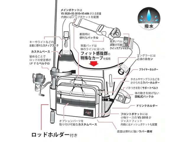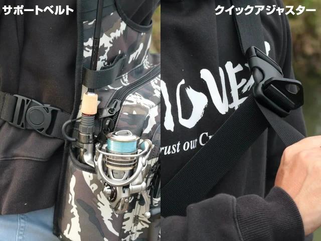 ロッドホルダーはホールドベルトによりガッチリと固定が可能で、ルアーチェンジの際やロッド2本持ちでのランガンに便利。ランディングネットやイカギャフなどもさすことができ、様々な魚種に対応。
