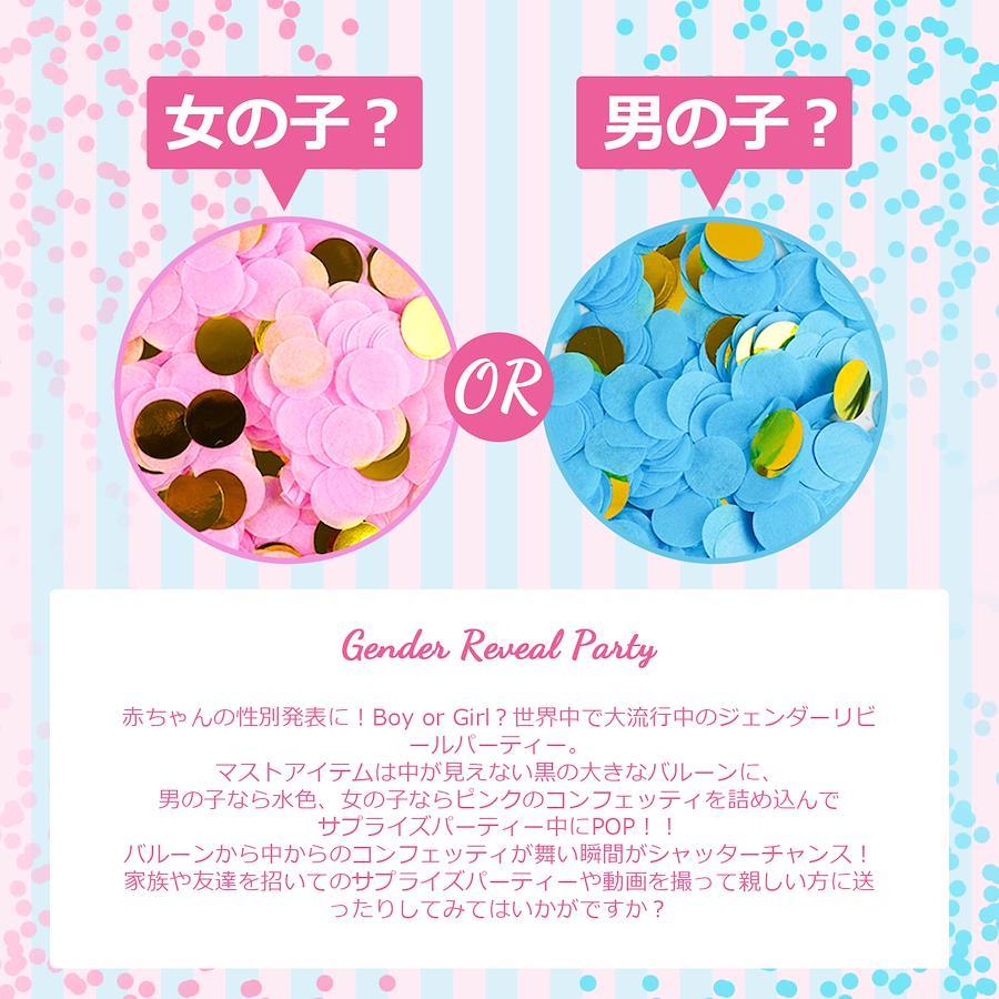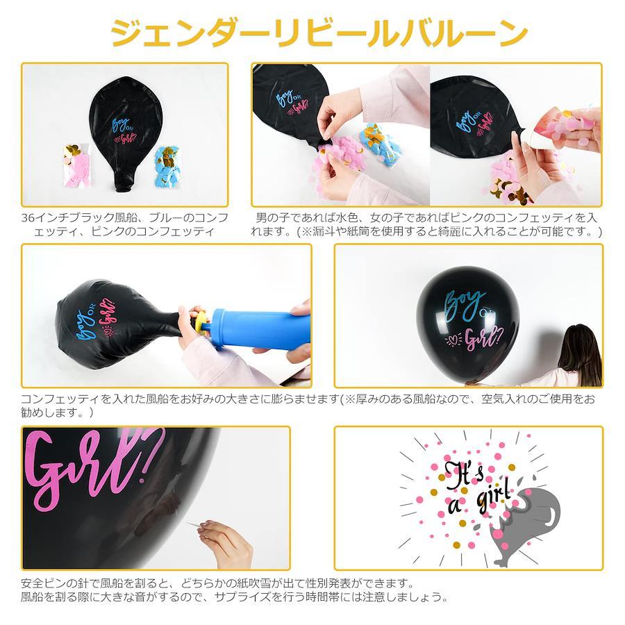 黒地に白い文字で「Boy or Girl」と書いてあるバルーンに、男の子か女の子か判別するためのブルーかピンクのコンフェッティが入っています。ベビーシャワーや妊娠お祝い等の発表のタイミングで風船を割ってサプライズ演出ができます。風船を割ると中のコンフェッティが舞い、パーティーが華やかで盛り上がること間違いなし!セット内容:36インチのboy or girl?バルーン×1個、女の子用のピンクのコンフェッティ×1袋、男の子用のブルーのコンフェッティ×1袋。紙ふぶきがブルーなら男の子、ピンクなら女の子で、生まれてくる赤ちゃんに合わせて紙吹雪を入れてお使いください。また、バルーンの色がブラックになっているため、中の紙吹雪が見える心配はありません。Boy or Girl発表のサプライズ!ママからパパへ発表、家族に発表&お祝い、友人同士でベビーシャワーに発表&一緒にお祝いなど・・・お腹の中は男の子か女の子かを発表!サプライズパーティーに演出として、黒いバルーンを割ると、中の入っているバルーンの色で男の子か女の子かわかります!Lausatek(ロサテ)は赤ちゃんが生まれて100日目の記念日をはじめ、ハーフバースデー、1歳、2歳・・・お子様の誕生日を楽しく盛り上がるバルーンやパーティーグッズをご提供いたします。これからお子さまの誕生日祝いを迎えるパパ、ママたちの手助けなれば嬉しいです。ご注意:空気の入ってない状態で発送いたします。出荷時に目視で検品を行っておりますが、膨らませての検品ができない商品の為、稀にお客様へ不良が届いてしまう可能性がございます。付属のシールをご使用される場合、貼り付ける材質によっては壁紙の破れや塗装が剥がれる可能性があります。膨らませ過ぎや静電気、直射日光や尖ったものなどに触れると破損する可能性がありますのでお取り扱いにご注意ください。【免責事項】メーカーによる商品リニューアルに伴いパッケージ(内容量も含む)変更が行われた場合、新パッケージでお届け致します事ご了承願います。