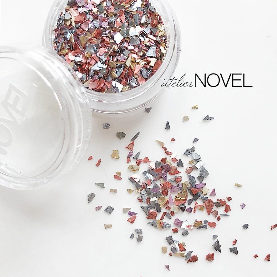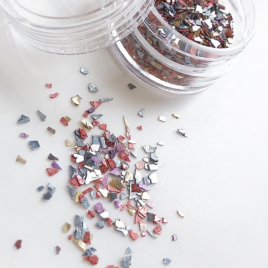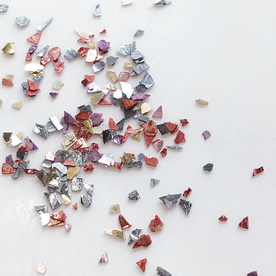 淡く合わせやすい赤、青、金、紫のミックスカラーの薄い金属のフレーク状の埋め込みやすいアイテムです。散りばめて一旦コーティングしシアー系のカラーを重ねると奥行き感のあるデザインに仕上がります。