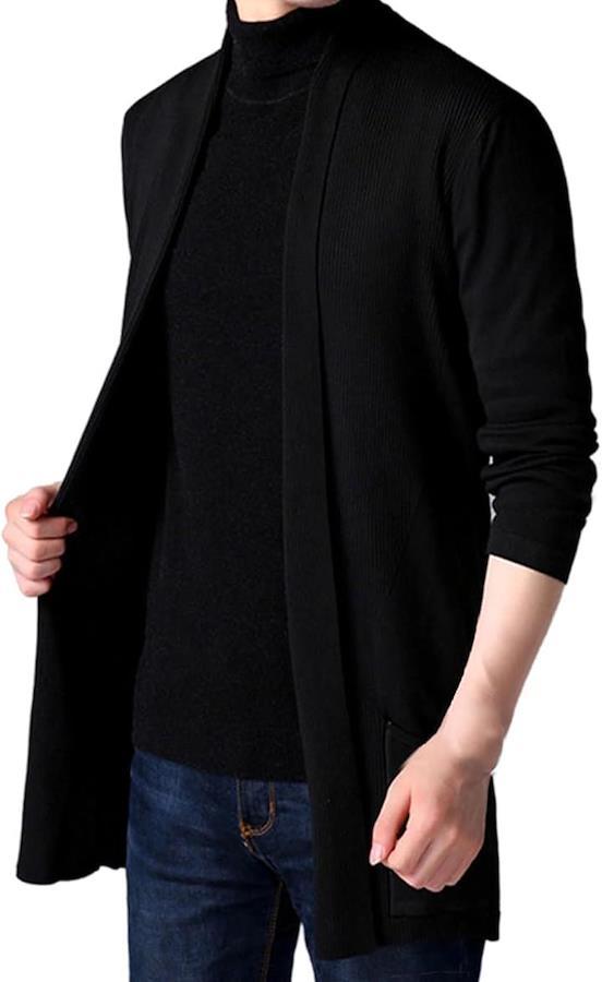 メンズ用 カーディガン、スリムに見せるシルエットがかっこいい、丈の長めな ロングカーディガンです。