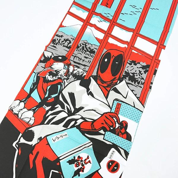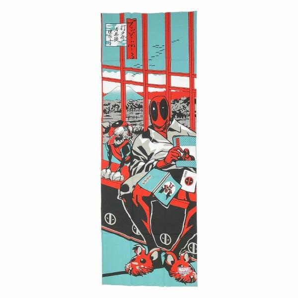 浮世絵や家紋などを連想させる、和風のモチーフに、コミックスのヒーロー達がマッチした、洒落たデザインの手ぬぐいです!紅色の格子が印象的な窓からは遠くに富士山と鳥の群れ。窓辺にはホームウエアでリラックスするデッドプール。その横にはドッグプールの姿も!タペストリーとしても◎