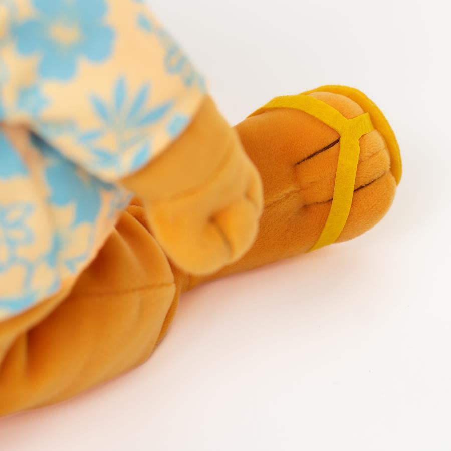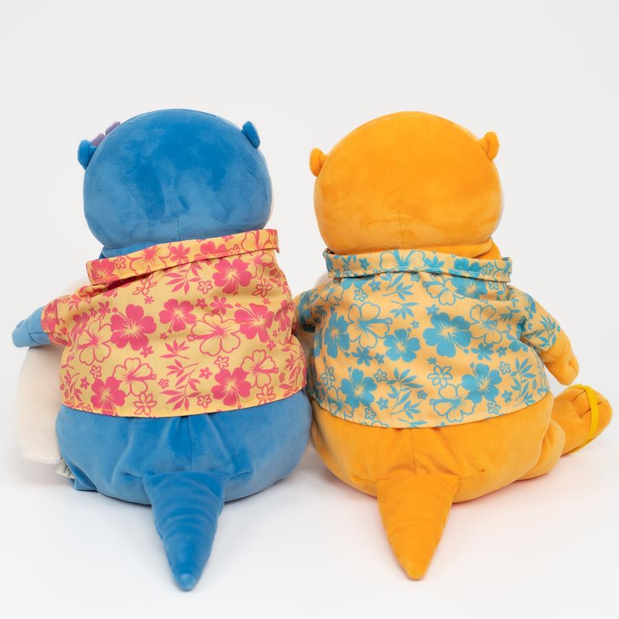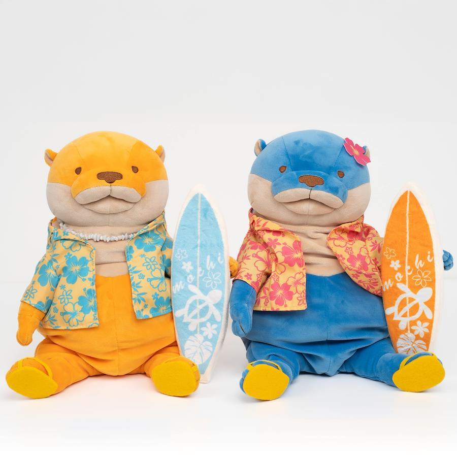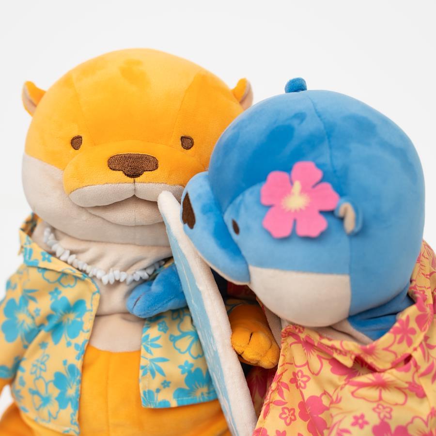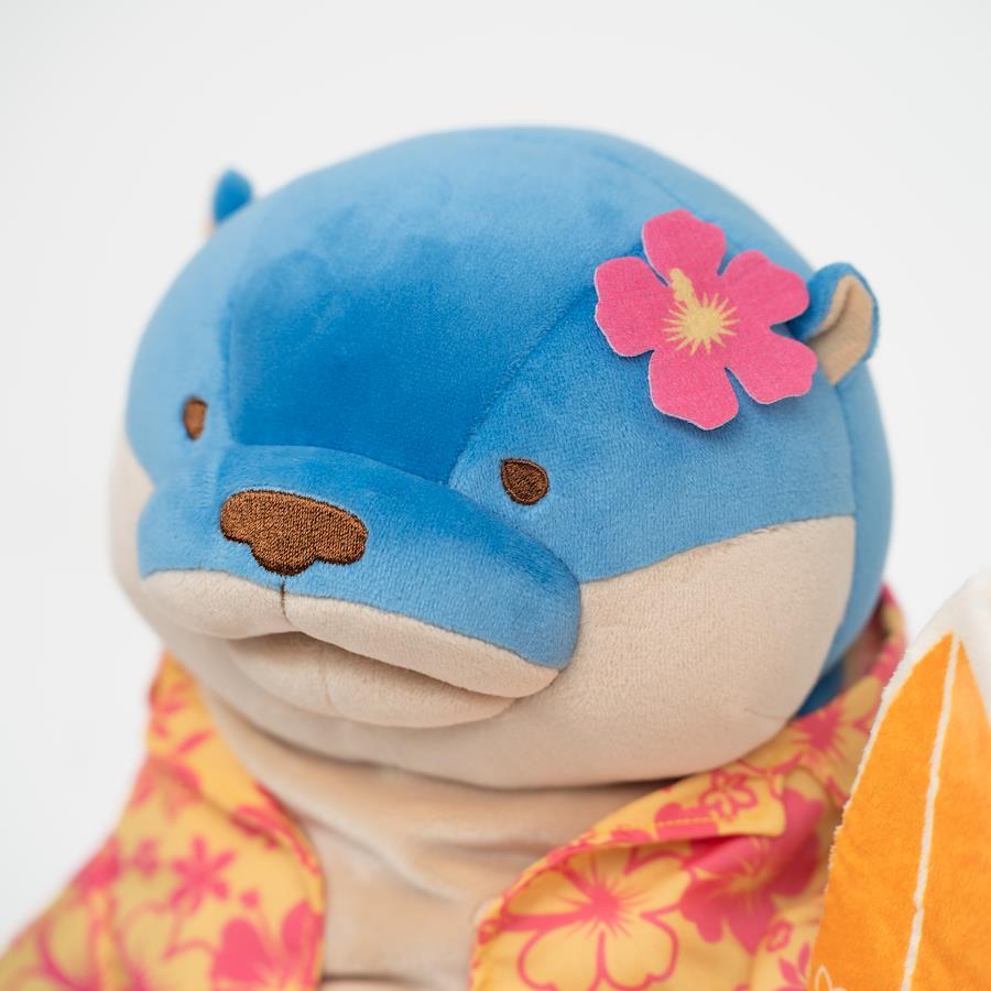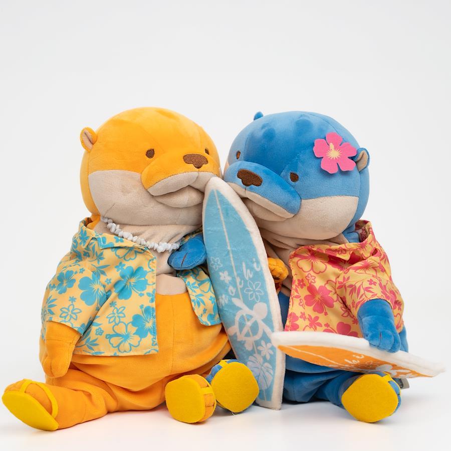 The Orange Surfer Otter comes dressed in a breezy flower shirt 🌺, flip-flops 🩴, and a necklace 📿.The Blue Surfer Otter wears a similar tropical shirt and flip-flops, but adds a hibiscus flower 🌸 next to the ear for a Hawaiian twist.