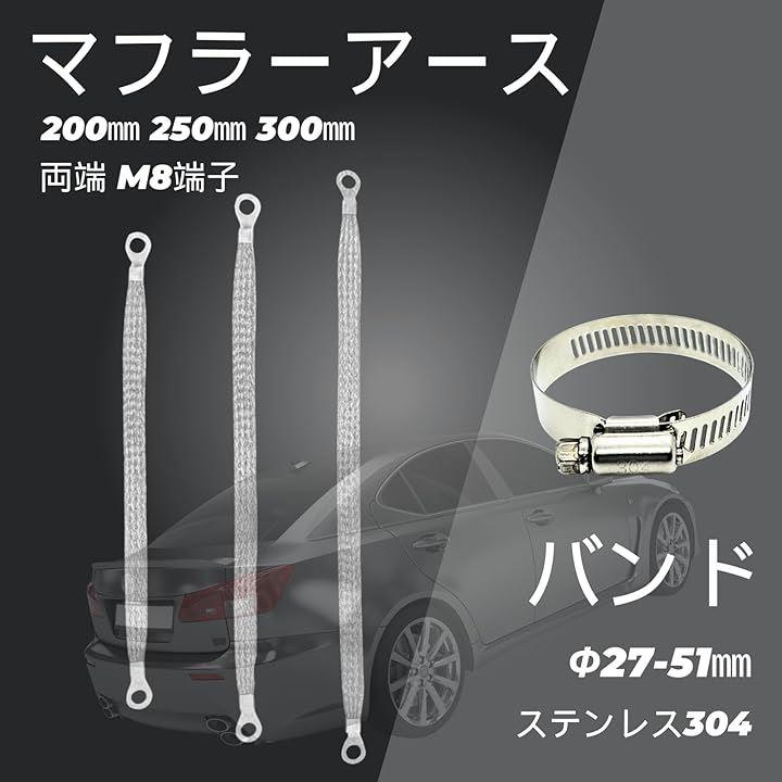 静電気除去 排気効率向上 トルク・レスポンスアップに 「商品仕様」 *セット内容:マフラーアース *サイズ:200mm、250mm、300mm *リング端子内径:両端8mm(M8) *素材:錫メッキ銅 *平編み6sq *マフラーバンド *サイズ:27mm-51mm *素材:ステンレス