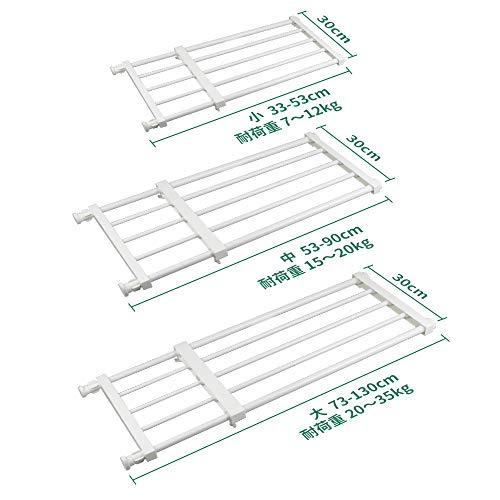 ◆【改良型・耐荷重が更に強い】材質 パイプ:鉄製 エポキシ樹脂粉体塗装樹脂 部品:ABS樹脂 合成ゴム 耐荷重:約15-35kg(最短時35kg、最長時15kg)つっぱり棚はボールが太く、しっかりした作りで、耐荷重が倍にします。重い物を乗せでも湾曲しなく、水を触れてもサビやカビが出ないです。(日本語説明書付き) ◆【段差のある壁に対応する】奥行30cm、沢山な物が載せられるワイドタイプで、スリムな突っ張り棚より収納スペースが広がります。ボールが自由に伸縮できるので、段差のある壁にも取り付けられます。取り付けた後でも棚のスライド部分が自由に調整できます。使用しない時に取り外すことも可能です。 ◆【棚板付き・滑り止め・安定】棚板が4本付いており、平な棚面に小物を載せるのに便利です。壁に接着する部分は4つの滑り止めゴムが付き、摩擦力を増加して、各種壁面にも気軽に対応します。ネジやクギを使わずに壁に突っ張るので、賃貸などの壁に穴がある心配もなく、弱粘着な壁紙が剥がれる心配もないです。 ◆【デッドスペースを有効活用】すき間、玄関、浴室、キッチンなど場所に設置するとすっきり片付きます。クローゼット、シューズラック、収納棚、本棚、食器棚として使えます。立てて突っ張れば傘などが掛けられます。猫と小型犬を逃亡防止に利用できるだけでなく、お子さんの安全や防犯用柵代わります。 ◆【日本語説明書付き・品質保証】パッケージ:本体*1 ネジ*2 四角鉄片*2 滑り止めゴム*4 「幅33~53cmの棚板:2枚 幅53~90cmの棚板:4枚 幅73~130cmの棚板:6枚」 ※ネジ固定用の四角鉄片は2つがあります。※弊店の突っ張り棚はバネ式ではありません!ご承知ください!万一製品に不備がありましたら、ぜひメールにてご連絡ください。弊店は新品を再送致します。もしくは注文全額を返金致します。