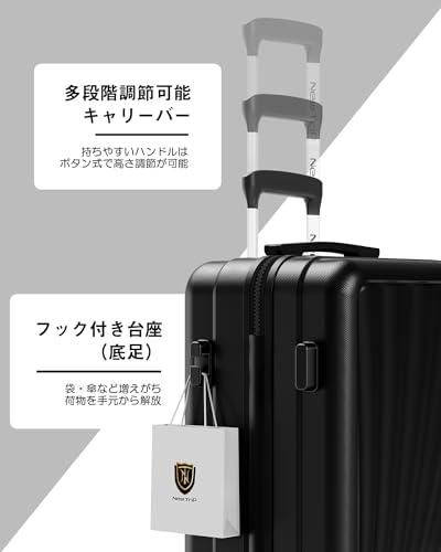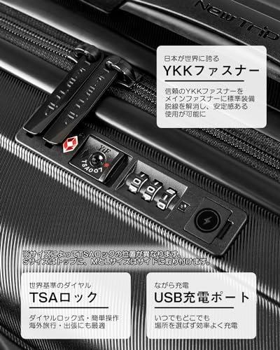 ??【ストッパー付き静音ダブルキャスター&USB充電ポート付き&物掛けフック】360度回転可能の8輪ダブルキャスターは、静音と耐久性抜群で、凸凹道でもスムーズに走ることができます。また、ストッパーが付いているため、坂道や電車内などスーツケースを止めたい時に便利です。便利なUSB充電ポート付き、場所を選ばずいつでもどこでも移動しながら効率よく充電ができます。キャリーケースのボディ側面に手提げ袋など掛けられるフックを搭載しています。外出中増えがちな荷物を、手持ちから解放してくれる便利機能です。 ??【高品質なボディ&信頼のYKKファスナー】ABS樹脂は軽くて弾力性と割れに強く、PC(ポリカーボネート)樹脂は耐衝撃性・断熱材に優れる、両素材を混合した耐久性が高いハードタイプの高品質ボディを実現しています。また、日本が世界に誇るYKKファスナーをメインファスナーに標準装備。ファスナータイプのスーツケースによくあるファスナーの不具合(ファスナー脱線や開き)を解消し、長期にわたり安定した使用感が可能となりました。 ??【多段調節キャリバー&握りやすい2層ハンドル】アルミ合金製の超軽量のキャリバーは伸縮可能で、ご自分の身長に合わせて、最適な高さに調節できます。2層式で設計されたハンドルは、手に当たる部分に柔らかい素材を使用しており、荷物を入れた状態でも手に食い込みにくく長時間持っていても手が痛くなりにくいのが特徴です。 ??【合理的な仕切りデザイン&安心のTSAロック】密閉されたU字型コンパートメントのおかげで、荷物を入れてもばらばらになりません。メッシュ状のポケット付きで、入れた物が一目でわかります。固定バンドを装備し、荷物崩れを防止します。また、世界基準のTSAロック搭載しています。アメリカ空港(グアム・ハワイ・サイパン含む)では必需品です。ダイヤル式ロックなので鍵を無くす心配がないのも魅力です。 ??【安心の日本ブランド&1年間保証】New Tripはあらゆるシーンで安心してご利用いただける日本のスーツケースブランドです。高品質にこだわり、アフターサービスにも対応しています。通常使用で1年以内に不具合が発生した場合、無料で修理また交換させていただきます。万が一、初期不良があった場合は迅速に新品交換させていただきます。