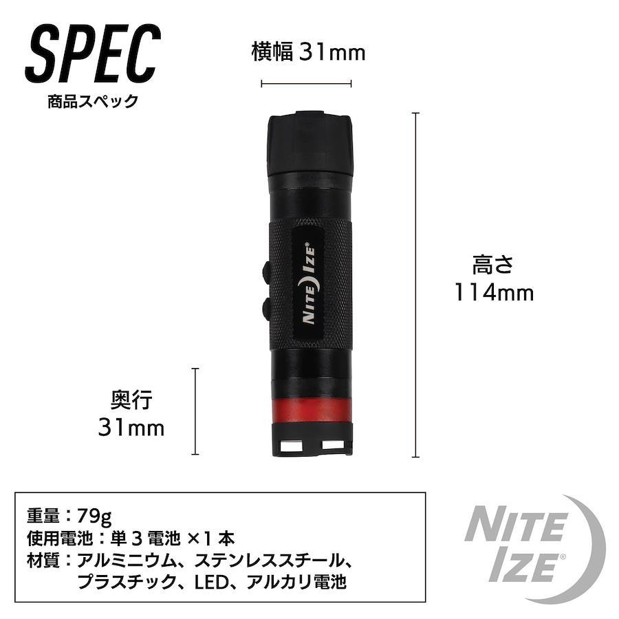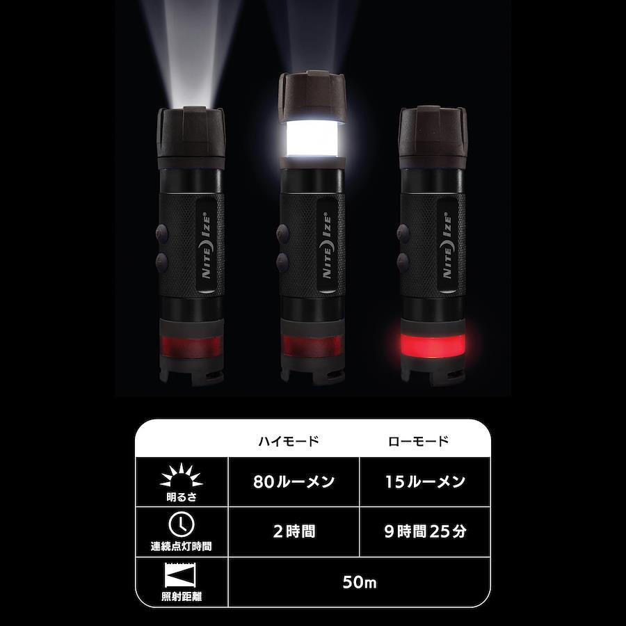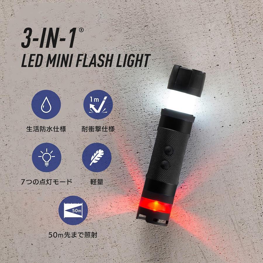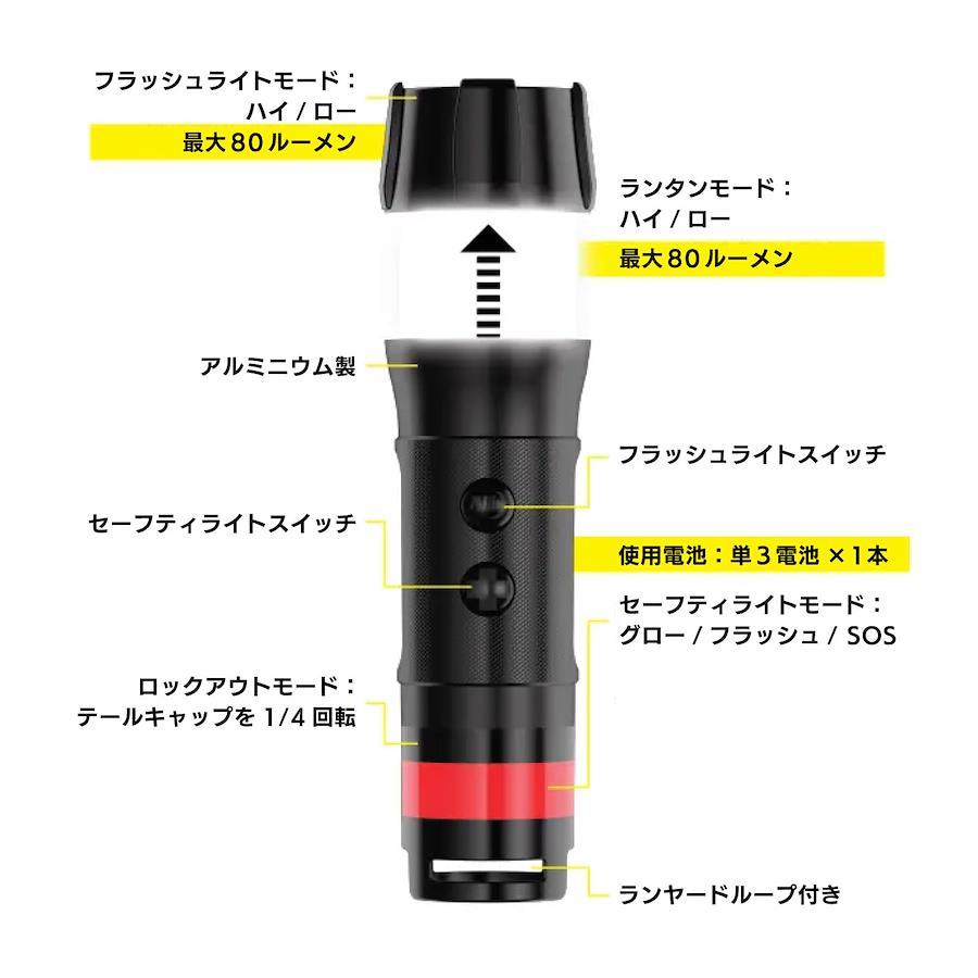 ●フラッシュライトとして、ランタンとして、セーフティライトとして3種類のライトを1つに凝縮したイノベイティブライト。●3イン1LEDフラッシュライトの機能をそのままコンパクトに。車のグローブボックスや防災緊急バッグに入れておくのに便利です。●ランタンは80ルーメン。●本体底部のスイッチで赤いセーフティライト(点灯・点滅・SOSモード)。【仕様】●使用電池:単3アルカリ電池×1本●連続照射時間:ハイモード約2時間、ローモード約9時間25分●照射距離:最大50m●防滴仕様ミニ3in1懐中電灯、ランタン、セーフティライト7つのモード - 懐中電灯:ハイ&ロー、ランタン:ハイ&ロー、安全ライト:グロー、フラッシュ、SOS。単3電池1本付属。80ルーメンの懐中電灯。