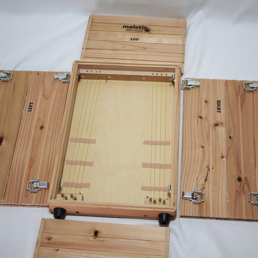 大きさ演奏時 幅約30cm x 奥行31.5cm x 高さ46.8cm収納時 幅約30cm x 奥行10cm x 高さ46.8cmボディ材 日本産吉野杉15mm打面材 フィンランドバーチ2.5mm裏板 シナ合板2.5mm響き線 4 x 2 全弦独立調整可色 クリア付属品1 京都西陣織結束バンド2 結束バンド(天板・側板)3 調弦用スパナ