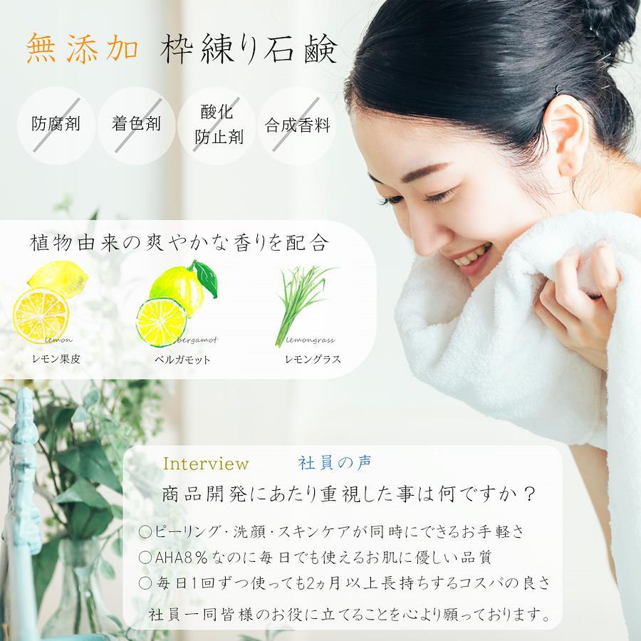 成分:カリ含有石ケン素地、水、 aha (高配合8%)、 プラセンタエキス 、加水分解 コラーゲン 、 ヒアルロン酸Na 、 グリチルリチン酸2K 、レモングラス油、ベルガモット果実油、レモン果皮油