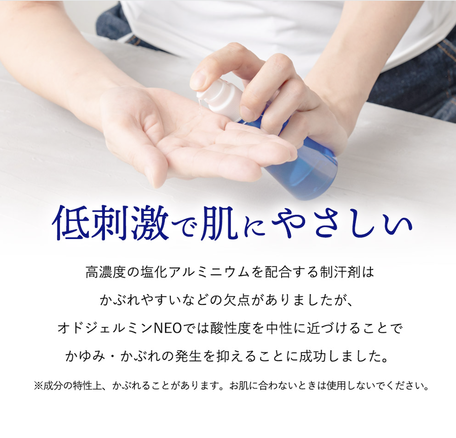 楽天で一番売れている制汗ジェル。なんといってもトロミが特徴。塩化アルミニウム13%配合剤は昔からありますが、液ダレしやすい・カブレカユミがでやすいと難点がありました。そこで薬剤師社長が考案したのが、トロミをつけて塗りやすく、酸性を和らげカブレカユミを抑えることに成功。夏でも冬でもオールシーズン売れています。汗どめはもちろん臭いを抑える効果もバッチリ。脇汗だけでは無く足の臭いにも効果あり。ブーツを脱いだ時、スポーツの後の足の匂いが消えているのに驚くはずです。