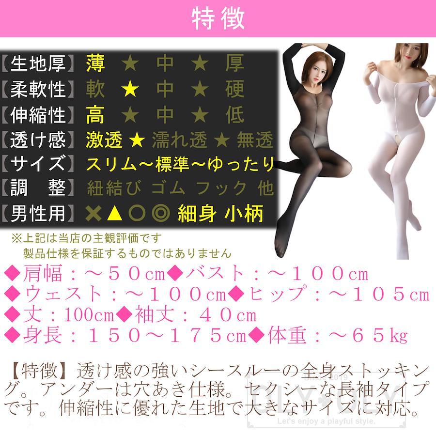 【商品内容】全身タイツ 黒1枚+白1枚=2枚セット 【サイズ】女性用フリーサイズ(S~LL相当)バスト:~100cm、ウェスト:~100cm、ヒップ:~105cm、丈:100cm、袖丈:40cm、身長:150~175cm、体重:~65㎏ 【カラー】ブラック・ホワイト 【特徴】透け感の強いシースルーの全身ストッキング。アンダーは穴あき仕様。セクシーな長袖タイプです。伸縮性に優れた生地で大きなサイズに対応。 ※デリケートな素材のため、爪やアクセサリーを引っかけないよう、取り扱いにご注意ください ※他にもルームドレス・ベビードール・レオタード・マイクロビキニなど、豊富なバリエーションをご用意しております 【使用上の注意】 洗濯はぬるま湯にて軽く手洗い・室内干しを推奨。色物は色落ちしますので白物と一緒の選択は避けてください。衣類に接着されているアクセサリーなどは洗濯により外れることがあります。海外製品につき、糸のほつれや縫製の甘い部分などはご了承願います。生産ロットにより予告なく仕様が変更されることがあり、写真と異なる場合は現物を優先とさせていただきます。下着類はデリケートな素材が多いため、着脱時に爪やアクセサリーなどで引っ掻いたりしないようご注意ください。 こんな用途におすすめ:ハロウィン・クリスマス・バレンタインデー・忘年会・新年会・コスプレパーティ等の余興、イベント衣装やインナーとして。インスタ・SNS・グラビア・記念写真など撮影用衣装として。結婚記念日・結婚祝い・婚約祝い・出産祝いなど記念日のプレゼントやジョークグッズとして。男性が着用可能なコスプレもございます。女装用・セックスレス・マンネリ化の解消にも。アニメキャラ・癒し・萌え・熟女・学生・SM系~過激ベビードール・極小マイクロビキニ・ボディストッキング・スクール水着など、人気セクシーランジェリーから注目のデザインをセレクト。 穴あき・胸開き・透ける素材・ハイレグ・Tバック・紐パン・レースなど、異なるバリエーションからお好みのセット・単品が選べます。 【商品内容】全身タイツ 黒1枚+白1枚=2枚セット 【サイズ】女性用フリーサイズ(S~LL相当)バスト:~100cm、ウェスト:~100cm、ヒップ:~105cm、丈:100cm、袖丈:40cm、身長:150~175cm、体重:~65㎏ 【カラー】ブラック・ホワイト 【特徴】透け感の強い