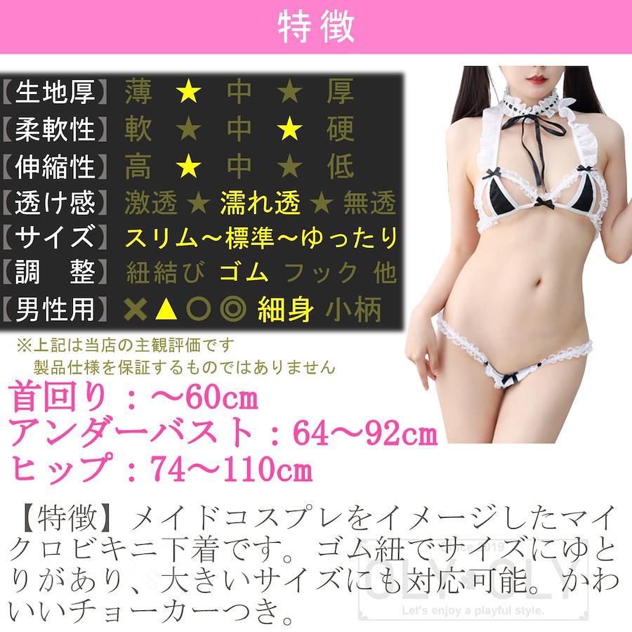 【商品内容】メイド風コスプレ下着(ブラ+ショーツ+チョーカー)+ニーハイストッキング+穴あきTバックショーツ=計5点セット 【サイズ】女性用フリーサイズ(S~L相当)首回り:~60cm、アンダーバスト:64~92cm、ヒップ:74~110cm 【カラー】ブラック×ホワイト(ストッキングとショーツのカラー・デザインはおまかせになります) 【特徴】メイドコスプレをイメージしたマイクロビキニ下着です。ゴム紐でサイズにゆとりがあり、大きいサイズにも対応可能。かわいいチョーカーつき。 ※他にもルームドレス・ベビードール・レオタード・マイクロビキニなど、豊富なバリエーションをご用意しております 【使用上の注意】 洗濯はぬるま湯にて軽く手洗い・室内干しを推奨。色物は色落ちしますので白物と一緒の選択は避けてください。衣類に接着されているアクセサリーなどは洗濯により外れることがあります。海外製品につき、糸のほつれや縫製の甘い部分などはご了承願います。生産ロットにより予告なく仕様が変更されることがあり、写真と異なる場合は現物を優先とさせていただきます。下着類はデリケートな素材が多いため、着脱時に爪やアクセサリーなどで引っ掻いたりしないようご注意ください。 こんな用途におすすめ:ハロウィン・クリスマス・バレンタインデー・忘年会・新年会・コスプレパーティ等の余興、イベント衣装やインナーとして。インスタ・SNS・グラビア・記念写真など撮影用衣装として。結婚記念日・結婚祝い・婚約祝い・出産祝いなど記念日のプレゼントやジョークグッズとして。男性が着用可能なコスプレもございます。女装用・セックスレス・マンネリ化の解消にも。アニメキャラ・癒し・萌え・熟女・学生・SM系~過激ベビードール・極小マイクロビキニ・ボディストッキング・スクール水着など、人気セクシーランジェリーから注目のデザインをセレクト。 穴あき・胸開き・透ける素材・ハイレグ・Tバック・紐パン・レースなど、異なるバリエーションからお好みのセット・単品が選べます。 【商品内容】メイド風コスプレ下着(ブラ+ショーツ+チョーカー)+ニーハイストッキング+穴あきTバックショーツ=計5点セット 【サイズ】女性用フリーサイズ(S~L相当)首回り:~60cm、アンダーバスト:64~92cm、ヒップ:74~110cm 【カラー】ブラック×ホワイト(ストッキングとショーツのカラー・デザイ