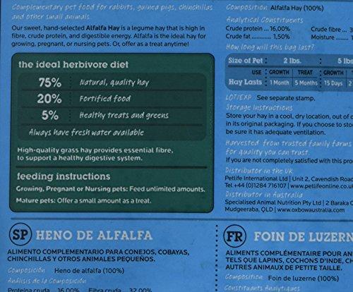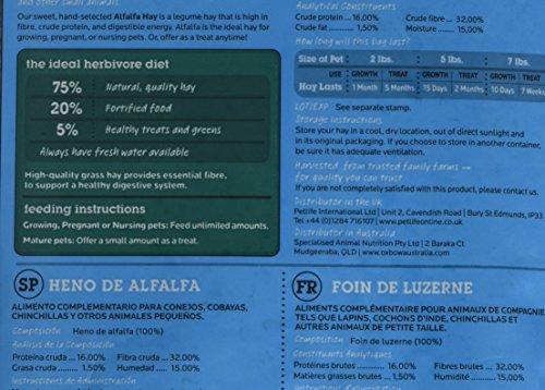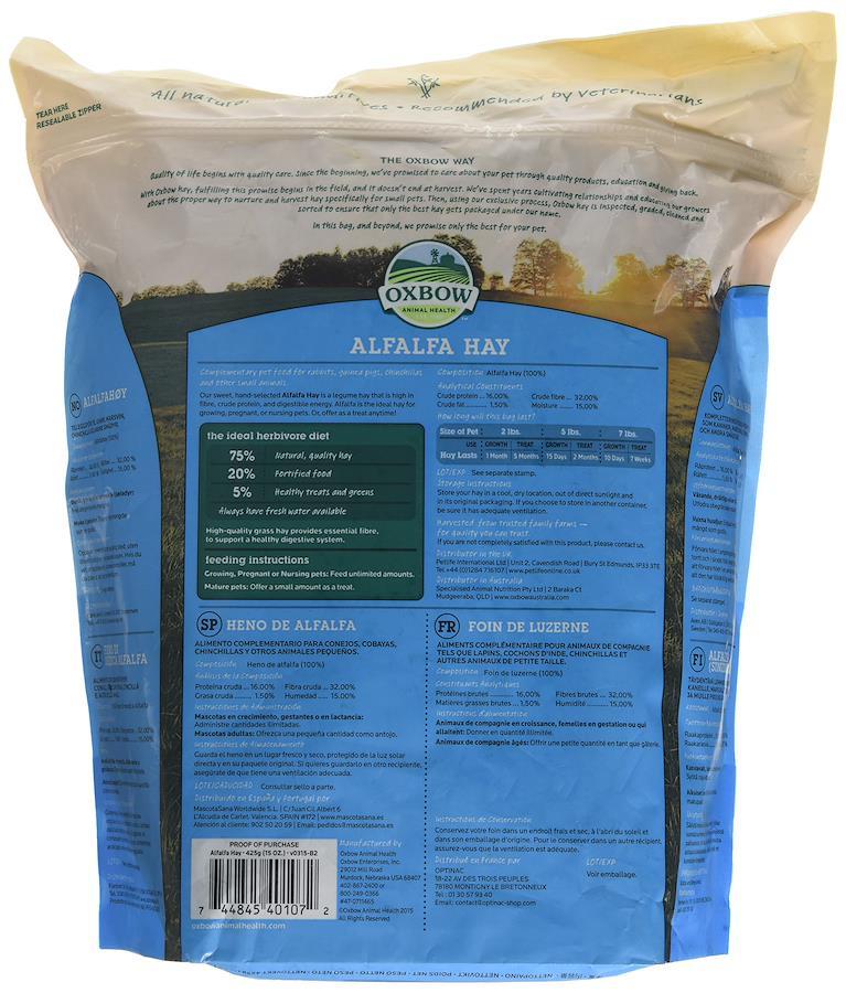 アルファルファは繊維質に富んだマメ科の植物です。草食動物の成長期(生後数ヶ月)に与える牧草として適しています。マメ科の牧草は、イネ科の干し草に比べて粗タンパク質・可消化エネルギーおよびカルシウムを多く含んでいます。アルファルファヘイは成長期・妊娠中または授乳期のペットにとって最適の食料であり、成熟ペットにとっては優れたおやつです。