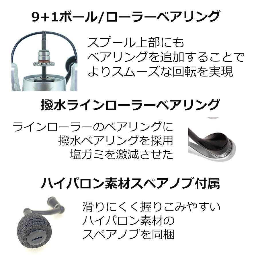 GT、マグロ、セイルフィッシュから、カンパチ、ヒラマサ、ブリなどの青ものゲームまで、あらゆるビッグゲームに完全対応する大型スピニングリール。フルメタルボディ、サイドプレート、ローターという堅牢、高耐久設計で、タフな仕様にもベストマッチ。メインギアとピニオンギアは、最先端のコンピューター制御と精密加工機によって作られたCNCギアを採用。素材はステンレスを使用し、優れた耐久性とスムーズな回転性を実現。国際規格で定められた防水等級、IPX6をクリアした防水機能により、常に波しぶきがかかるソルトウォーターゲームでも安心して使用できる。ローターの軽量化により慣性モーメントを10%低減し、巻き心地の軽さを向上。新設計のドラグシステムは、ベアリングを追加したことで滑らかな巻き上げを実現。撥水ラインローラーベアリングを採用し、ソルトウォーターゲームの宿命である塩ガミを激減。滑りにくく握りこみやすい、ハイパロン素材のスペアノブ付属。