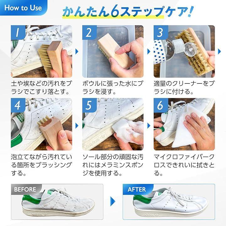 「使用方法」 1.土や埃などの汚れをブラシでこすり落とす 2.ボウルに張った水にブラシを浸す 3.適量のクリーナーをブラシに付ける 4.泡立てながら汚れている箇所をブラッシングする 5.ソール部分の頑固な汚れにはメラミンスポンジを使用する 6.マイクロファイバークロスできれいに拭きとる * 必要に応じてこの工程を繰り返す 7.自然乾燥させる
