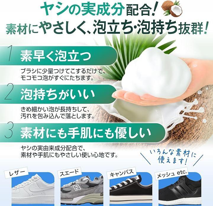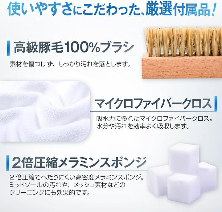 「使用素材」スニーカークリーナーはレザー、合皮、コットン、キャンバス、メッシュ、ゴムなどの様々な素材に使用可能ですが、スエードなど水分を吸いやすい素材にはおすすめしません。