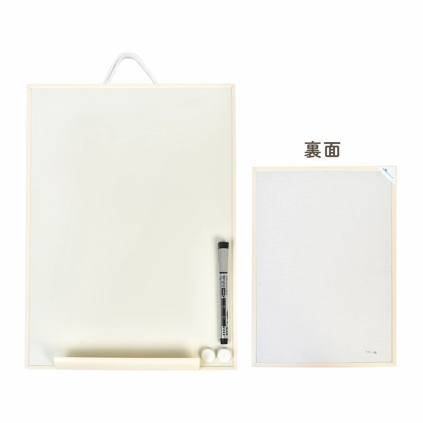 【オフホワイトボード A3】縦横で壁掛けが可能なA3サイズホワイトボード。一般的なホワイトカラーではなく目に優しいオフホワイトカラーを使用しており、部屋のインテリアに馴染みやすく見やすい仕上げに!メモなどを貼り付け出来るマグネットと、吊り下げ用金具と紐、クリーナーとマグネット付きのボードマーカーとその受け皿が付属しています。