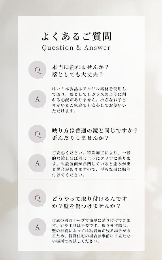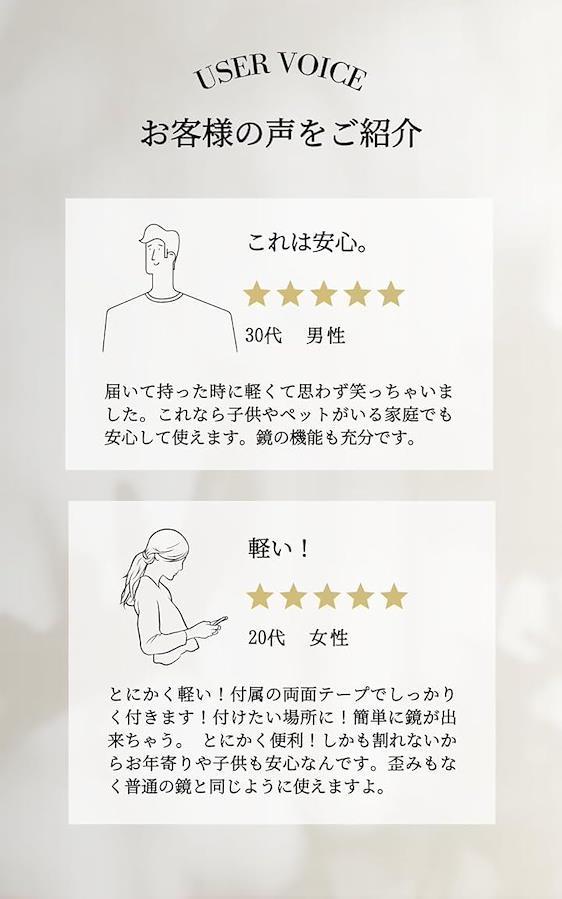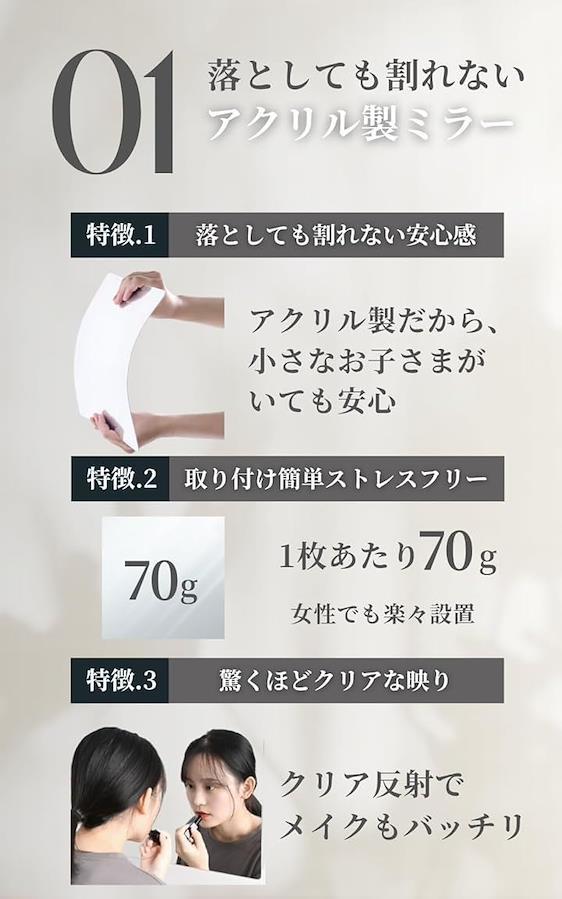 「安全第一。アクリルミラー」 飛散防止&軽量設計で、万が一落下してもケガのリスクを軽減。