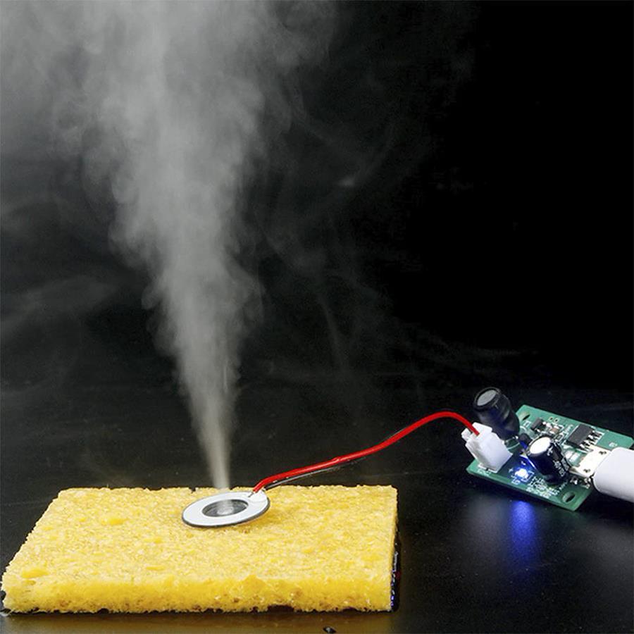【商品説明】・超音波式の加湿器に入っている超音波発生モジュールです。・水を細かく振動させ霧状に噴霧します。・霧粒は数ミクロン程度と微細なため、まるで白煙のような霧を発生します。・基板も小型にできているので、模型やジオラマにも組み込みが可能です。・水以外の液体を噴霧すると目詰まりする事があります。・特に粘度のある液体は霧状になりません。・振動子の配線が切れやすいので、取り扱い時にはご注意ください。