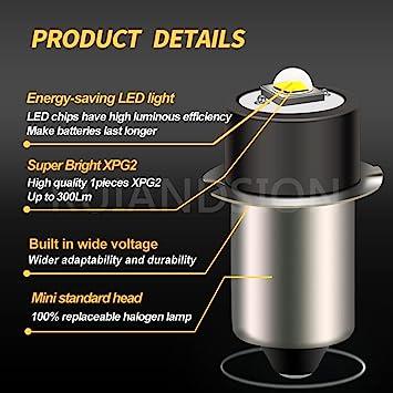 【超高輝度】このP13.5S LED懐中電灯電球は超高輝度チップを搭載しています。 カラー:ホワイト。 電圧:1-9V。ルーメン:300lm。【優れた適用性】1?9ボルトの電圧範囲に適用可能。6V 9V 懐中電灯に適しています。 1?6個のC&Dセルを備えた懐中電灯に使用できます。【ワイドアプリケーション】P13.5S ベース 1?9 ボルト LED懐中電灯電球の室内灯、バイク、トーチライト、懐中電灯ワークライトなどの交換。購入前に電球ベースのモデルを確認してください。【取り付けが簡単】懐中電灯のヘッドを本体から外して保持カラーを外し、古い電球に新しいLED電球を挿入して電球を交換します。【保証】お客様からの商品写真確認後、12ヶ月保証で新品交換は無料です。