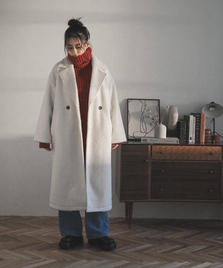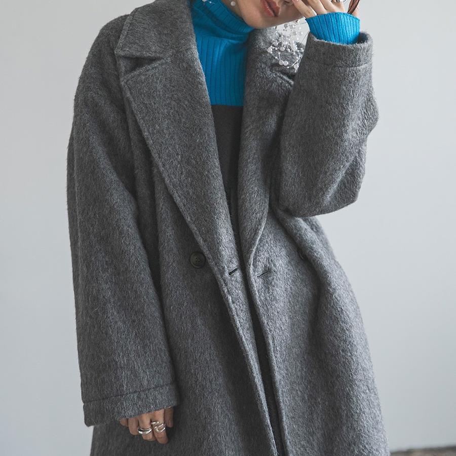 トレンドのシャギーを使用した上品な印象のテーラードコート。オーバーサイズがこなれ感を演出。