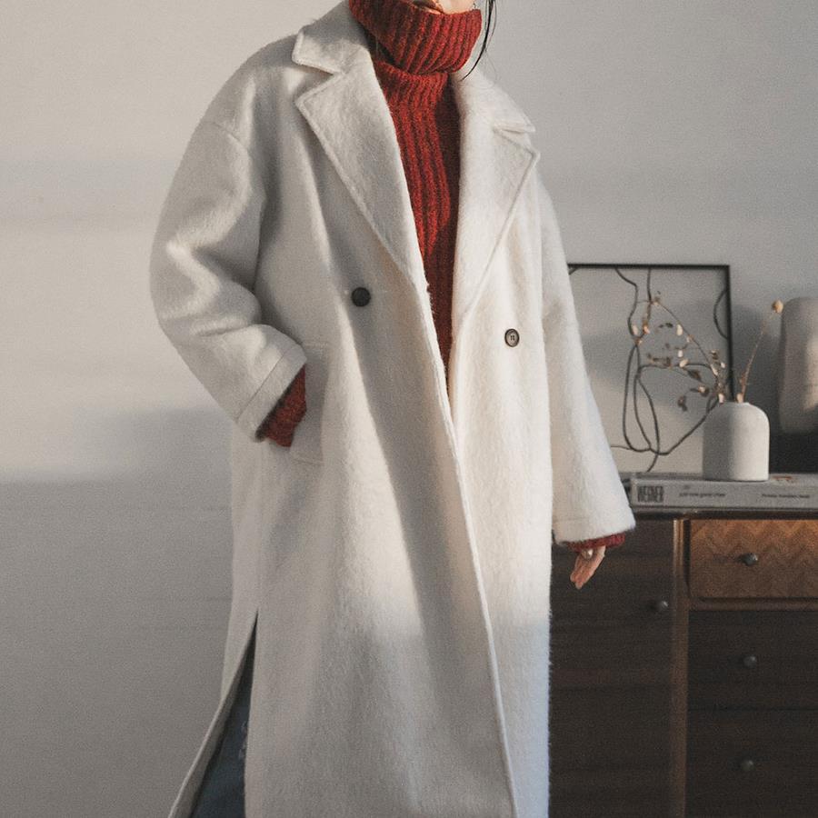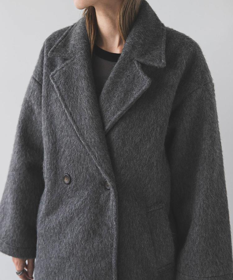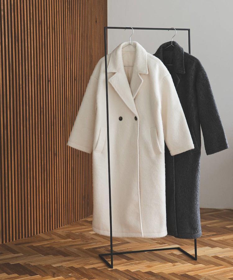 トレンドのシャギーを使用した上品な印象のテーラードコート。オーバーサイズがこなれ感を演出。