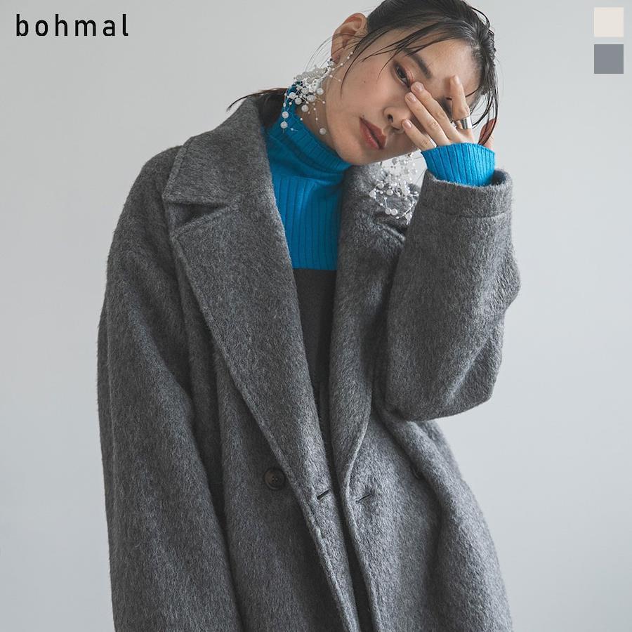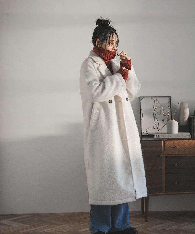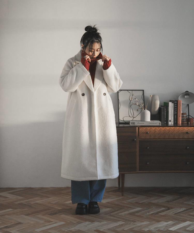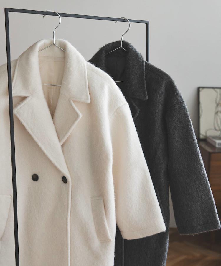 トレンドのシャギーを使用した上品な印象のテーラードコート。オーバーサイズがこなれ感を演出。