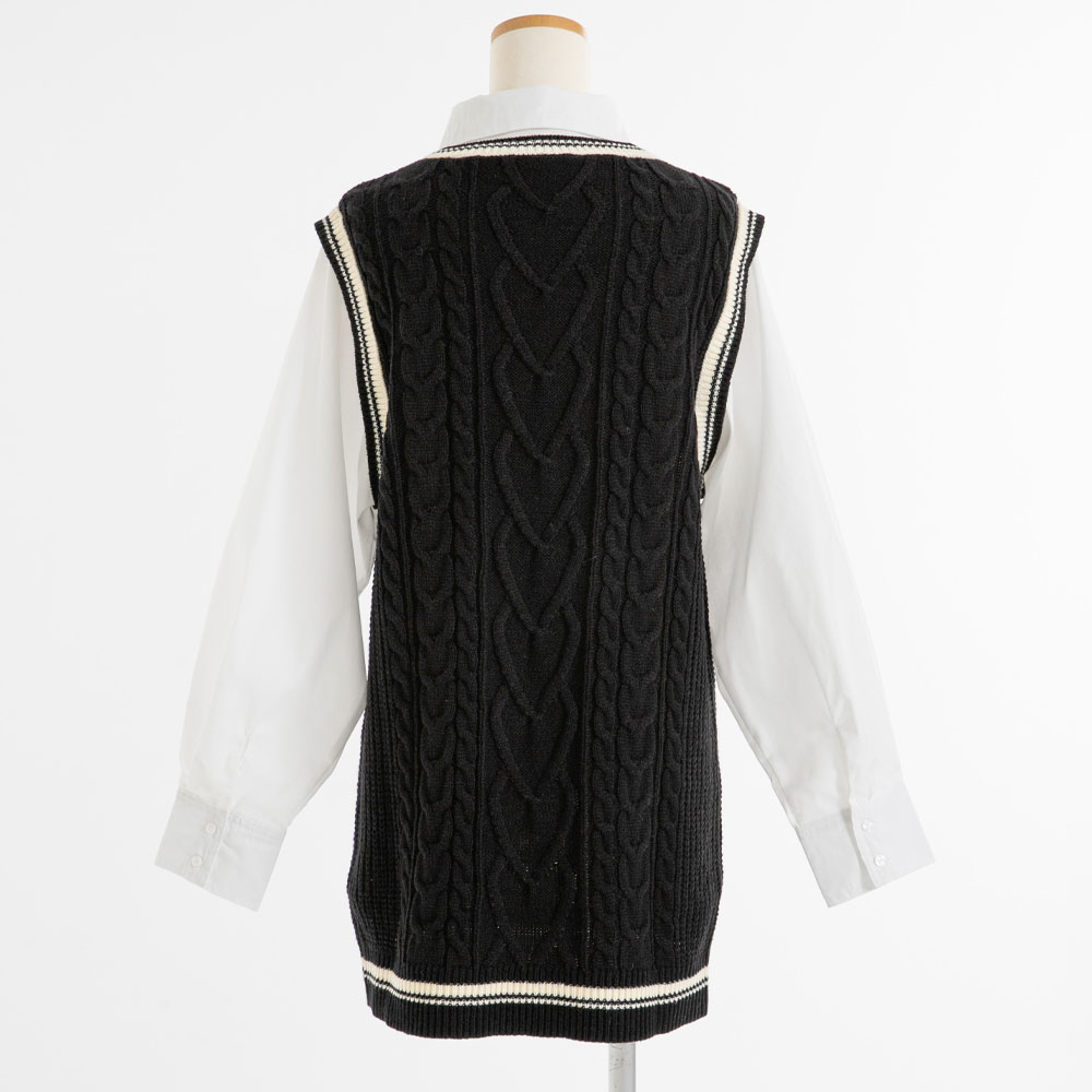 シャツとニットベストワンピのドッキングデザインワンピースのご紹介。【デザイン】トレンド感のあるプレッピーなデザインが可愛いレイヤード風ワンピース。ニット部分の立体的なハートケーブルがきゅんっとするデザインです♪袖はボリュームスリーブでゆるっとしたシルエットながら、ニット部分はIラインシルエットでスタイルアップしてくれます。シャツ襟の前立て釦を開けて、被りで着脱する仕様です。