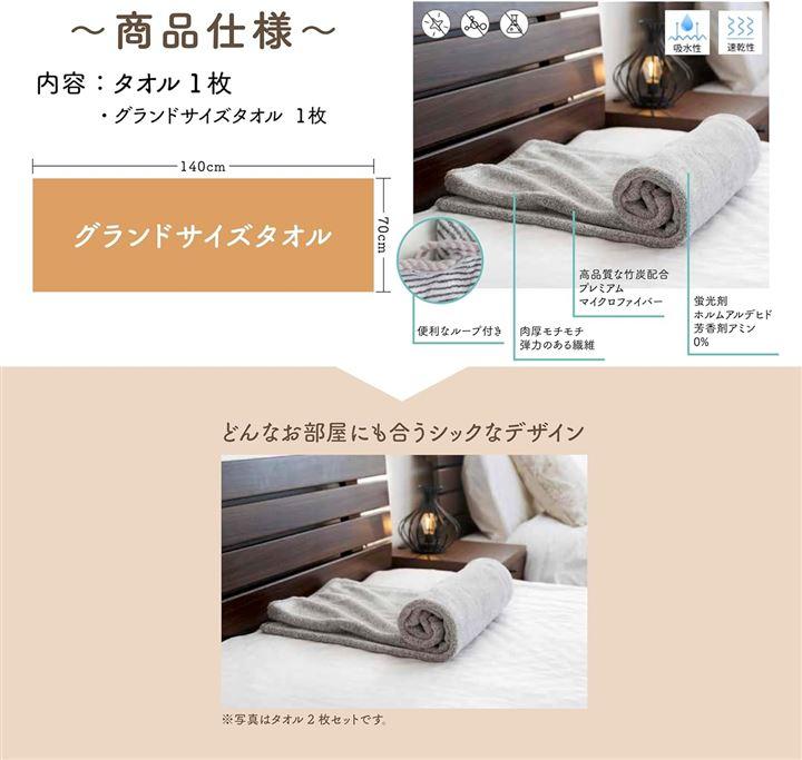 「内容:竹炭配合タオル1枚」グランドサイズタオル(70cmx140cm)1枚 「素材」竹炭マイクロファイバー(ポリエステル90%、ナイロン10%) 「カラー」グレー/グレーストライプ いずれかをお選びいただけます。