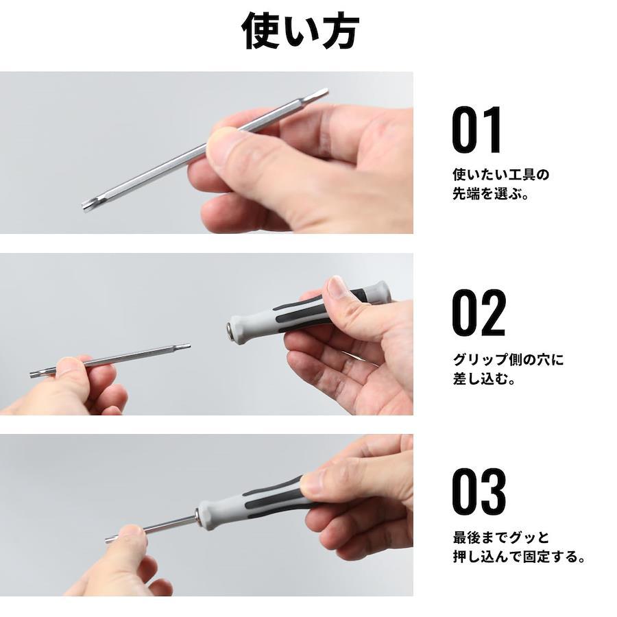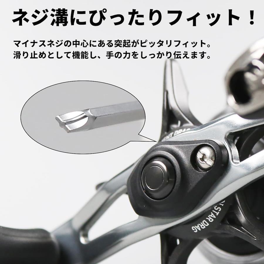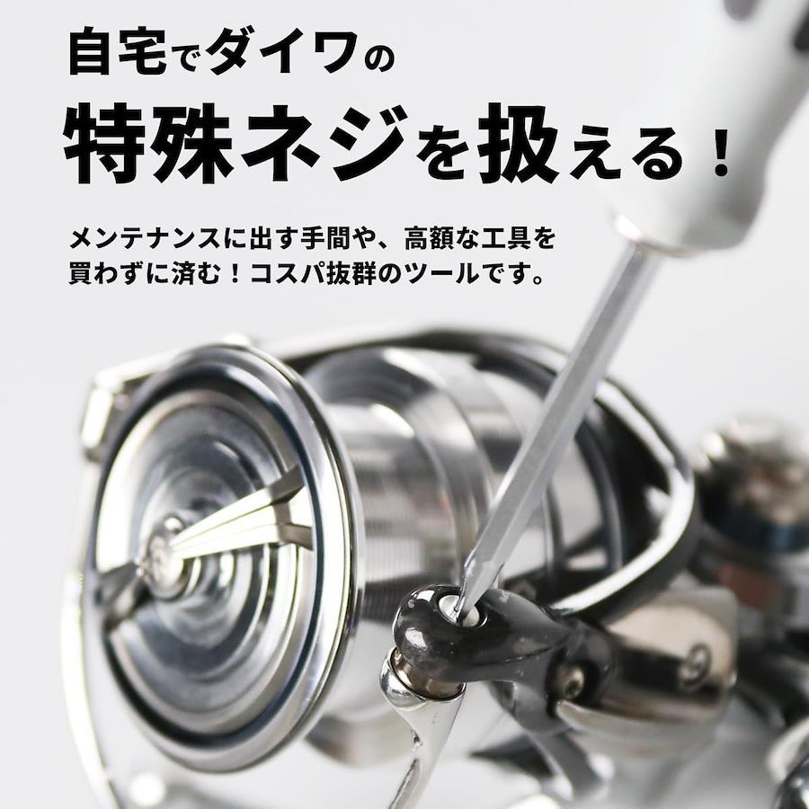 【SLP ベイトリール専用 メンテナンス ドライバー】 自宅でダイワの特殊ネジを扱える! メンテナンスに出す手間や、高額な工具を買わずに済む、コスパ抜群のツールです。ネジ溝にぴったりフィットする形状。マイナスネジの中心にある突起がぴったりフィットし、滑り止めとして機能するので手の力がしっかり伝わります。柄の末尾は回転する仕様。ドライバーをネジにあて、回転キャップを手のひらに押し付けて回せば、軸がブレることなく真っ直ぐねじ込めます。内容物:差し込みパーツ×2 グリップ×1