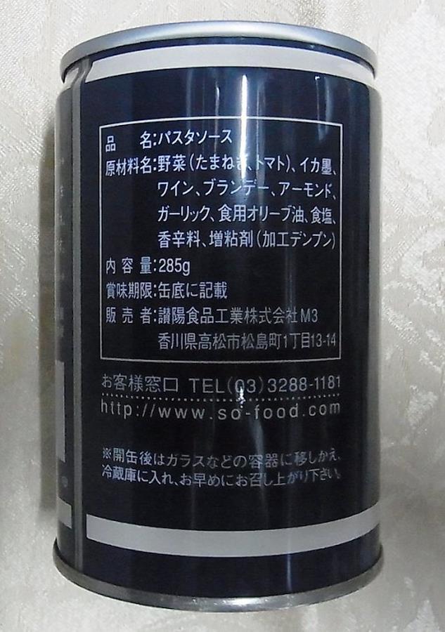 野菜(たまねぎ、トマト)、イカ墨、ワイン、ブランデー、アーモンド、ガーリック、食用オリーブ油、食塩、香辛料、増粘剤(加工デンプン) 原料原産国:国産、中国、ニュージーランド、アメリカ(たまねぎ)、チリ(トマト)、中国、タイ(イカスミ)