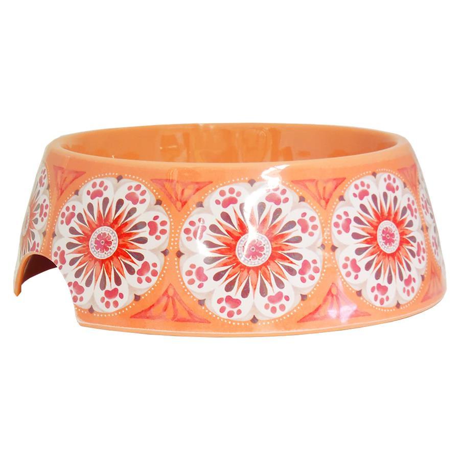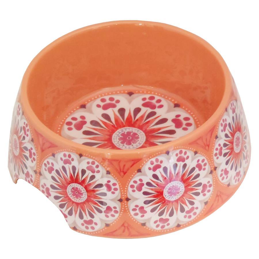 華やかなプリントが目を引くメラミン樹脂ボウル。食べやすくひっくり返りにくい富士型、底部にはすべり止めのゴム付きでカタカタ音を防ぎます。柄の中にはパウマークがデザインされています。