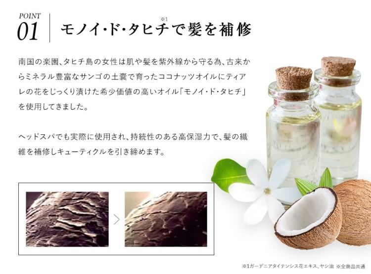 南国×ボタニカルエッセンス×パフュームでまるでヘッドスパしたかのように、髪と地肌をやさしくときほぐすシャンプー/トリートメント。ココナッツオイルにティアレの花をじっくり漬けた希少価値の高いオイル「モノイ・ド・タヒチ」の高保湿力で髪の繊維を補修しキューティクルを引き締め、スーパーフード「ノニ果汁」で地肌を整えすっきり健やかに。