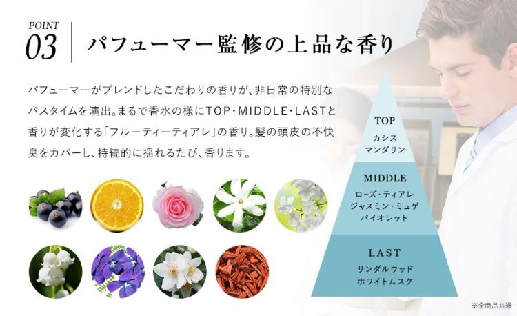 アミノ酸系ノンシリコン処方のシャンプーは、毛穴より小さいミクロでリッチな泡が、摩擦ダメージを防ぎながら汚れを逃がさず吸着。頭皮臭・フケ・かゆみを抑えながらもしっかり保湿してくれます。海藻×真珠×ボタニカルエッセンス配合のトリートメントは内側から外側までしっかり補修する濃厚クリーム。ドライヤー熱から髪を保護しながら、ダメージホールを埋めてヴェールで包むヒートアクティブ成分配合。パフューマーがブレンドしたこだわりの「フルーティーティアレ」の香りが髪や頭皮の不快臭をカバーし、持続的に香ります。まるでリゾートにいるような「至福のバスタイム」を。