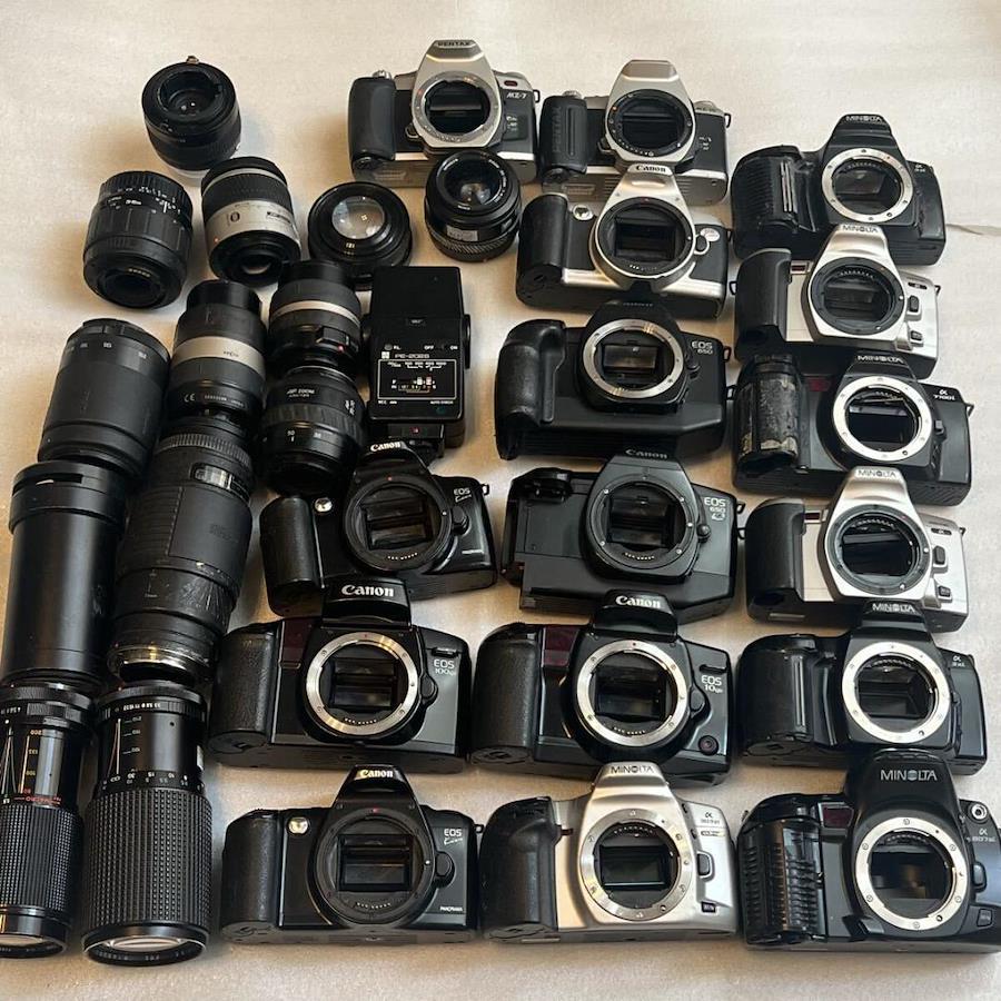 This is a massive bulk lot containing 16 film camera bodies, plus many additional lenses and accessories! 📸 The lot features popular brands like Minolta, PENTAX, and Canon, including models such as the 807si, EOS Kiss, MZ-7, and MZ-10.