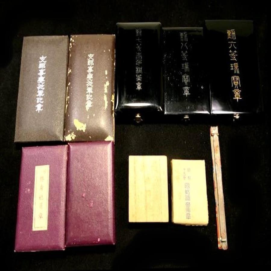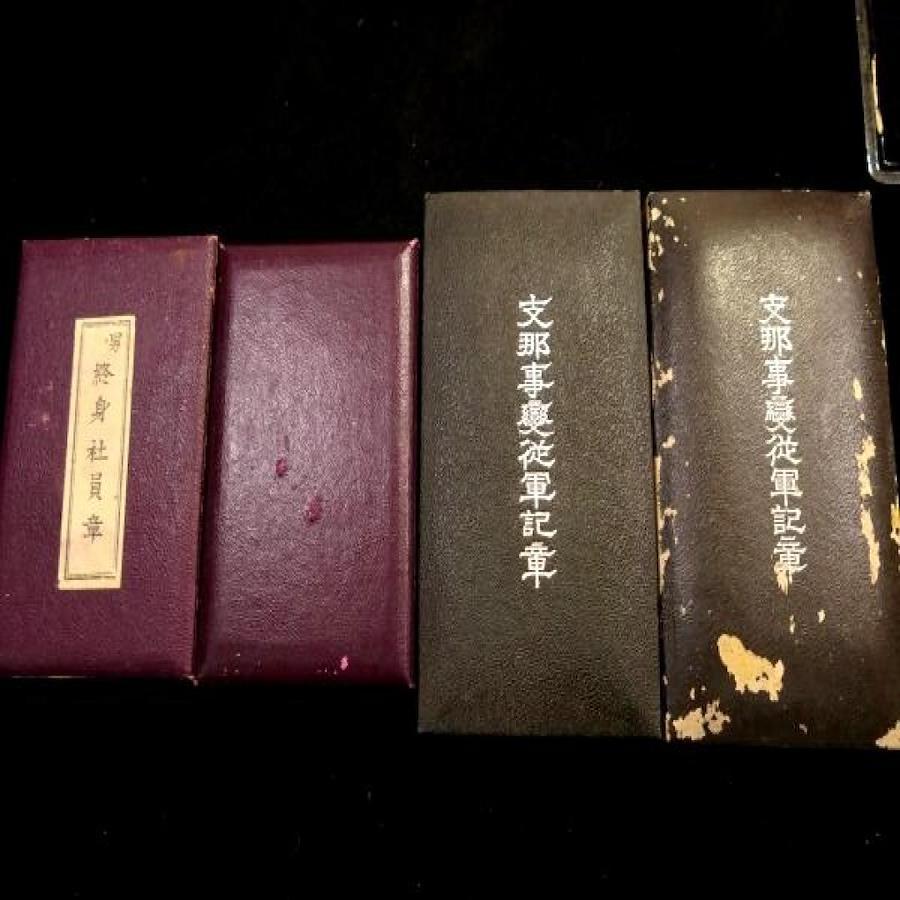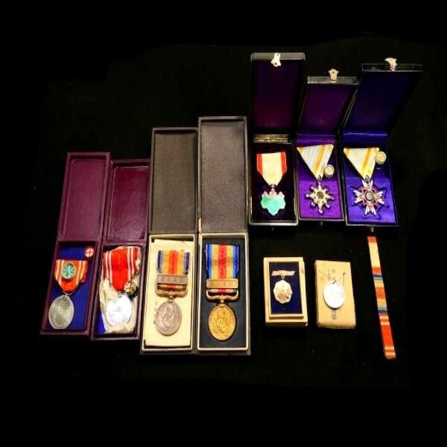 This is a unique assortment for enthusiasts of militaria and Japanese history, featuring various designs of medals, ribbons, and pins. Some items still come with their original presentation boxes (共箱).