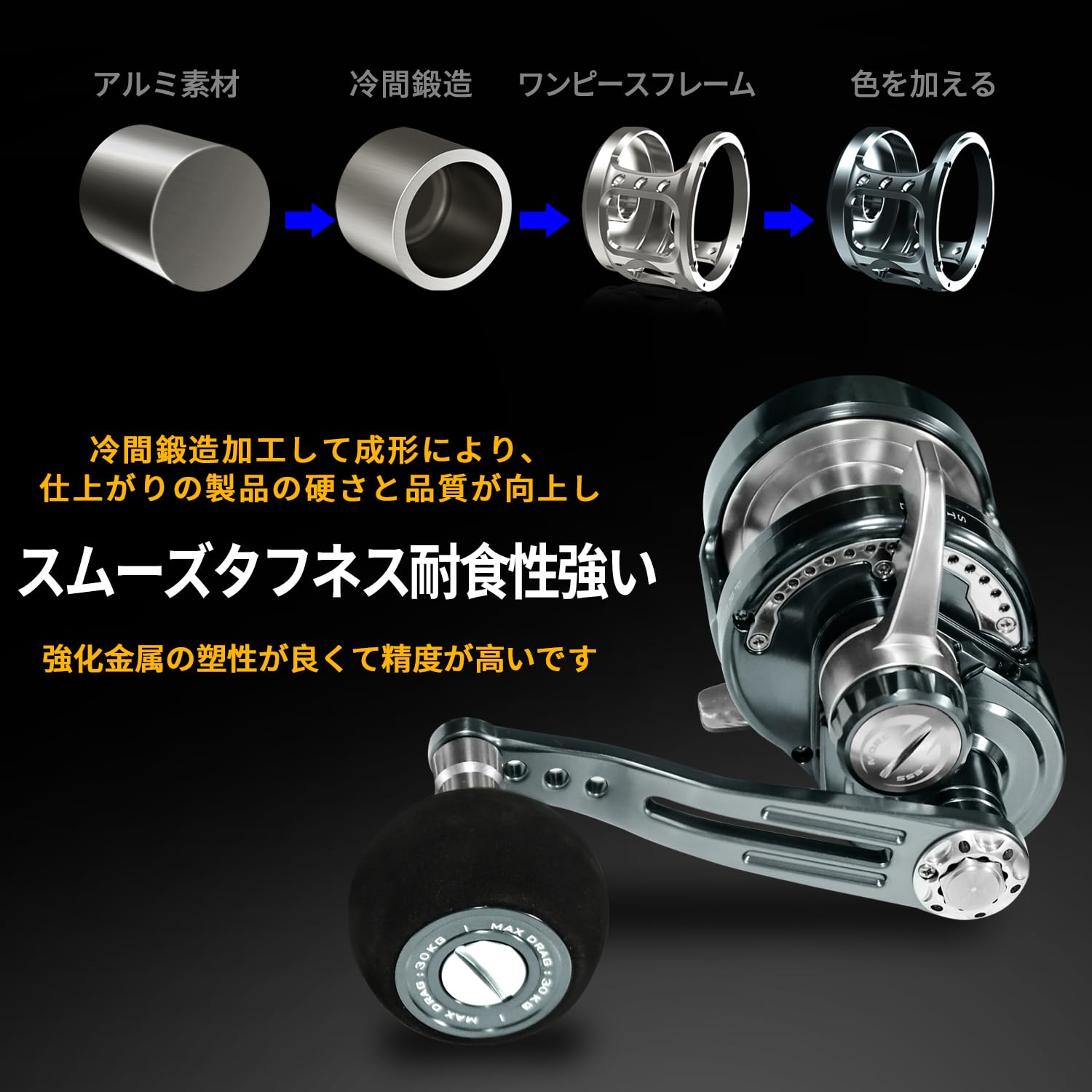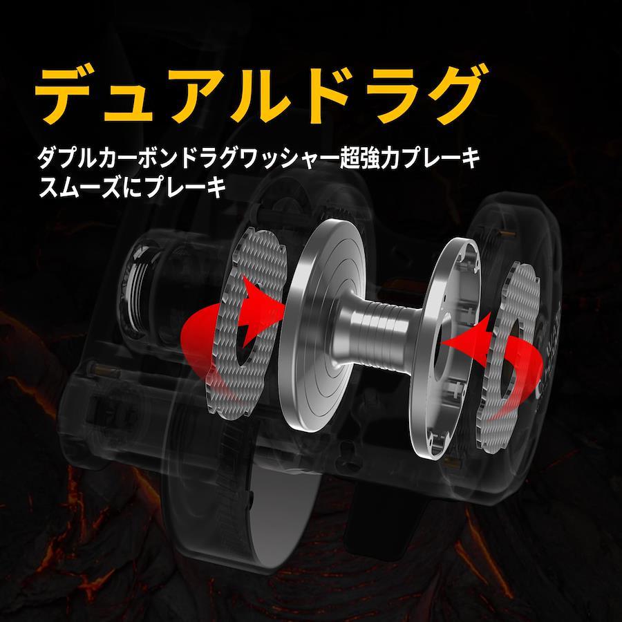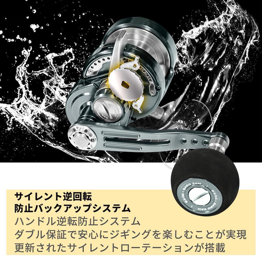【パラメータ】【ギア比】5.3:1 【ベアリング数】9+2BB 【自重】450g 【最大ドラグ力】25kg 【糸巻容量】:PE3号-400m 【最大巻取り長さ(ハンドル1回転当り)】97cm【レバードラグリール】WATACHAMPカリビアンジギングリールの特徴は、冷間鍛造フレームです。 他の競合品ほとんどは、最初に冷間鍛造ではなく、アルミニウムバーから直接機械加工されます。 冷間鍛造製法は、分子密度を高め、フレームをより強力にして大きなゲームの衝撃に耐えることができます。また、パーツの表面も明るく、剛性のある表面は引っかき傷防止能力を高めます。【可聴アラームスイッチ】を入れる魚が引っ掛かったときのアラーム音が聞こえ【カーボンクロスワッシャー防水機構内蔵ドラグ】デュアルドラグ,ダプルカ一ボンドラグワッシャ一超強力プレ一キ,スム一ズにプレ一キ,スムーズ、タフネス、信頼性の三拍子を備えたカーボンクロスワッシャー防水機構内蔵ドラグなどの機構を超精密ワンピースフレームされます。【アルミニウム合金ボディ】スムーズタフネス耐食性強い冷間鍛造加工して成形により、 仕上がりの製品の硬さと品質が向上し,強化金属の塑性が良くて精度が高いです,歪みを持たない高剛性のボディが生む安心感は限りなく大きく【物用レバードラグリール】泳がせ釣り、そしてトローリングなどにも対応する大物用レバードラグリール。そして真鍮ピニオンギアは世界クラスの日本のハマイ(浜井)ホブ盤によって正確にホブされています。このギアトレインは素晴らしいギア感触と信頼できるギア性能を提供します。