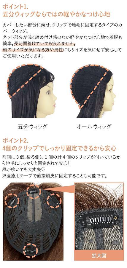 クリップで地毛に固定し半頭部分を広範囲にカバーできるウィッグです。