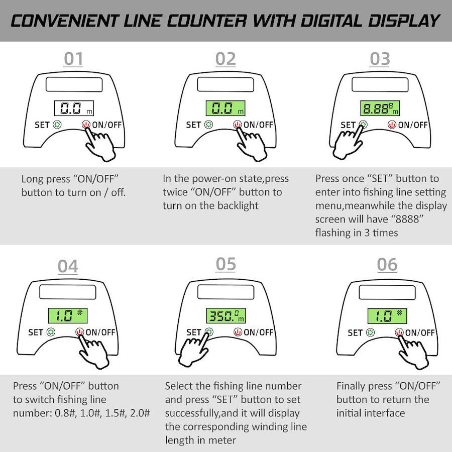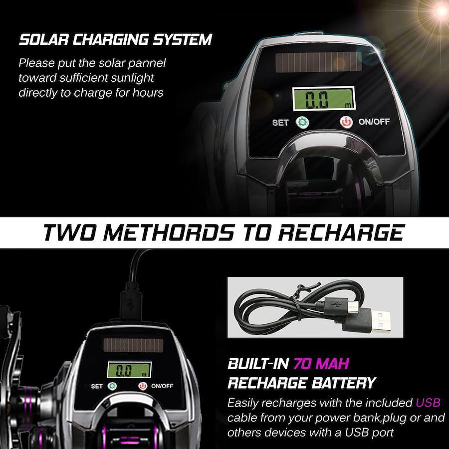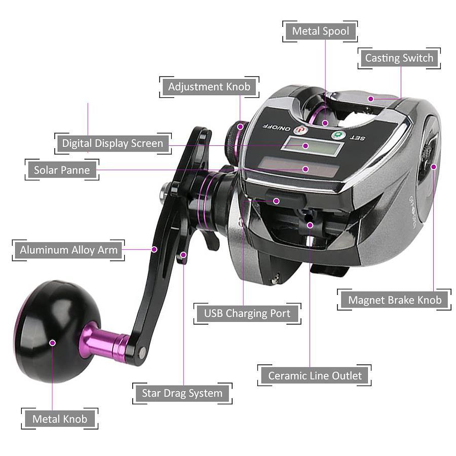 Consists of 8 strong magnets gives 10kg/22lb strong braking force.6+1BB bearing system will cast accurately and hook fastly.8.0:1 gear ratio gives high speed performance and smooth fishing time.Convenient line counter with digital display,choose the fishing line number you like(0.8# / 1.0# / 1.5# / 2.0#)and display the corresponding winding line length in meter.Built-in 70mAH battery recharges from your power bank,plug or any device with a USB port.