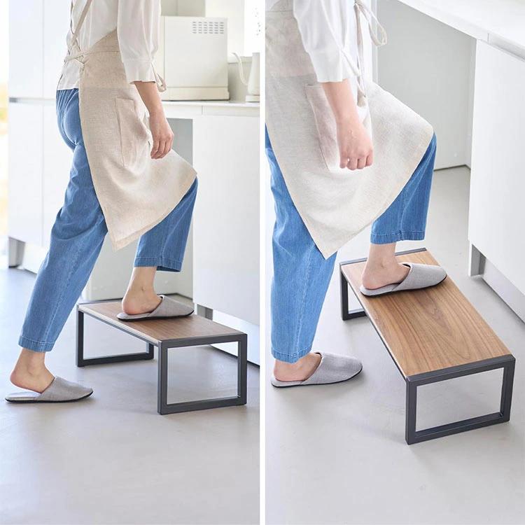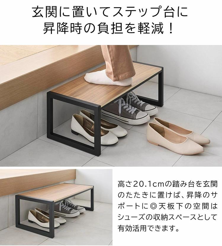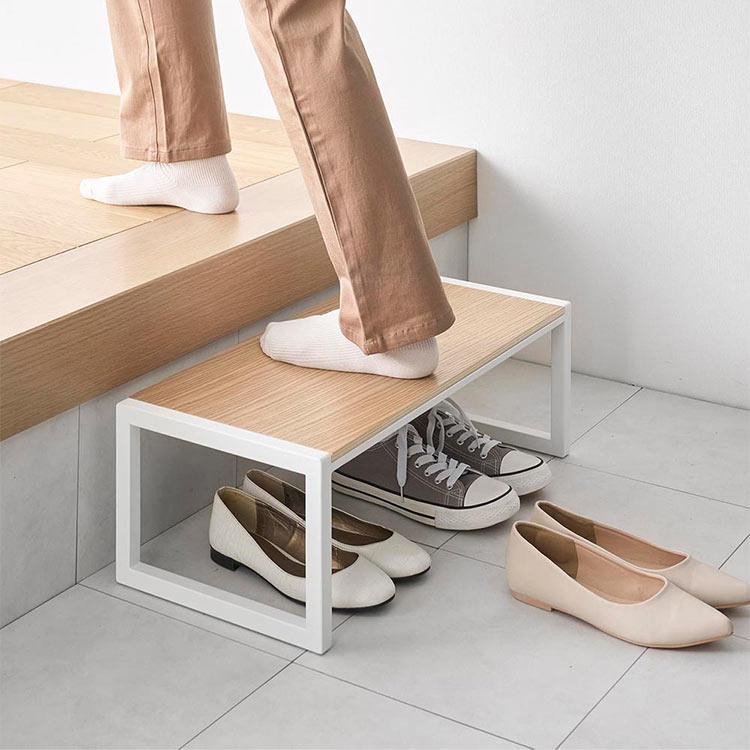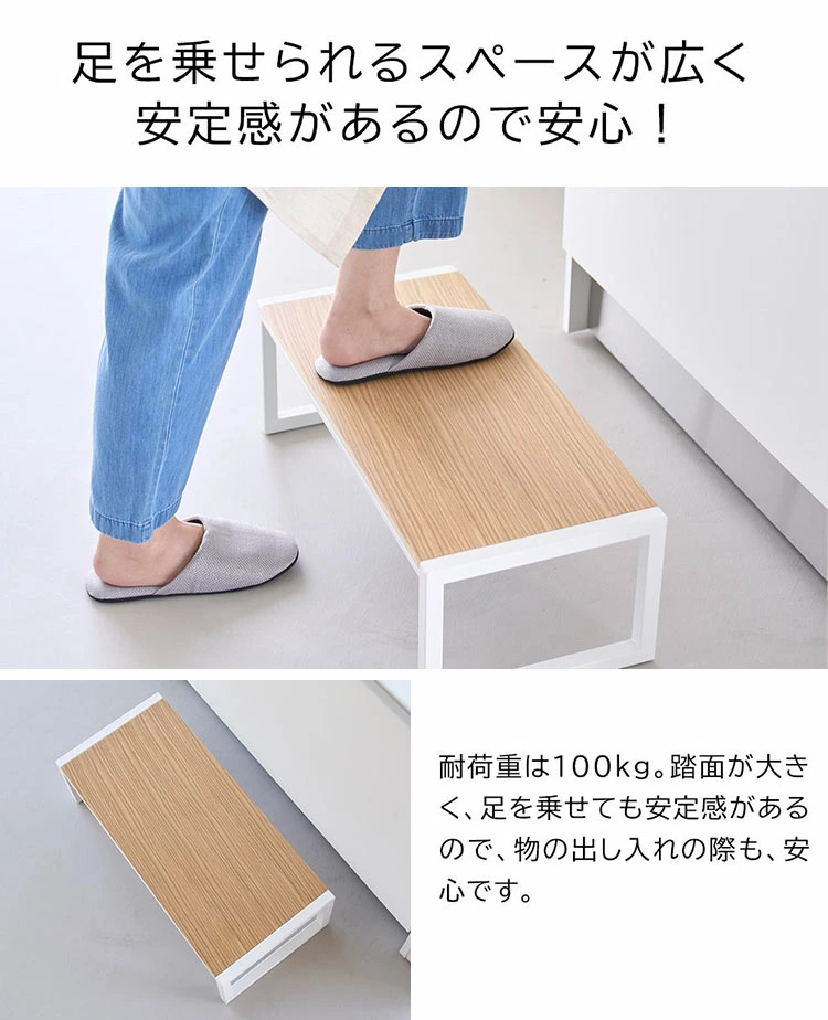 【踏み台 W60】安定感があり、お子様や年配の方でも安心して使える天板の面積が広い横幅60cmのワイドな踏み台です。エントランスでは玄関のたたきに置いて昇降のサポートに。天板下はシューズの収納スペースとして有効活用できます。天板の幅が広いので高い場所に収納した物を取り出す際も安心です。