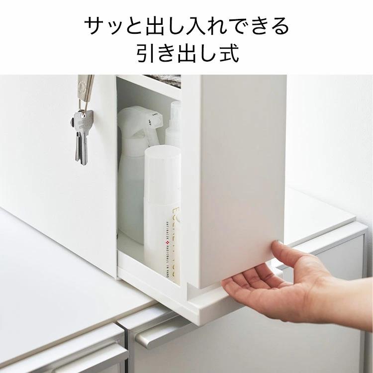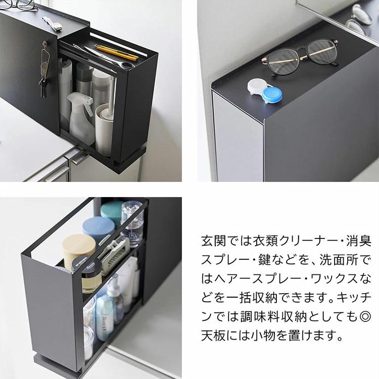 【隠せる引き出し収納】玄関、洗面所、キッチンなど場所を選ばず使える隠せる引き出し収納。棚板は2.5cmピッチで高さ調節が可能です。玄関では衣類クリーナーや消臭スプレー、鍵などを一括収納。ヘアースプレーやワックス、歯ブラシ類の収納として洗面所への設置や、キッチンでカップボードに設置し調味料収納としてもおすすめです。スチール製なので側面にマグネットが使えます。