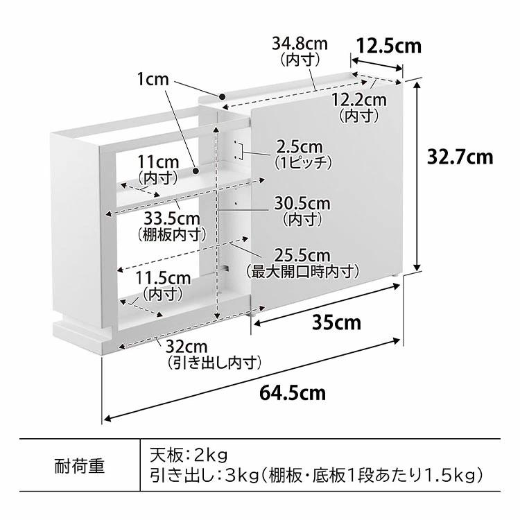 ■サイズ[ 外寸 ]約W12.5×D35~64.5×H32.7cm[ 内寸 ]天板:W12.2×D34.8×H1cm引き出し:W11.5×D32×H30.5cm棚板:W11×D33.5×H1cm ( 棚板は2.5cmピッチで高さ調節可能 )