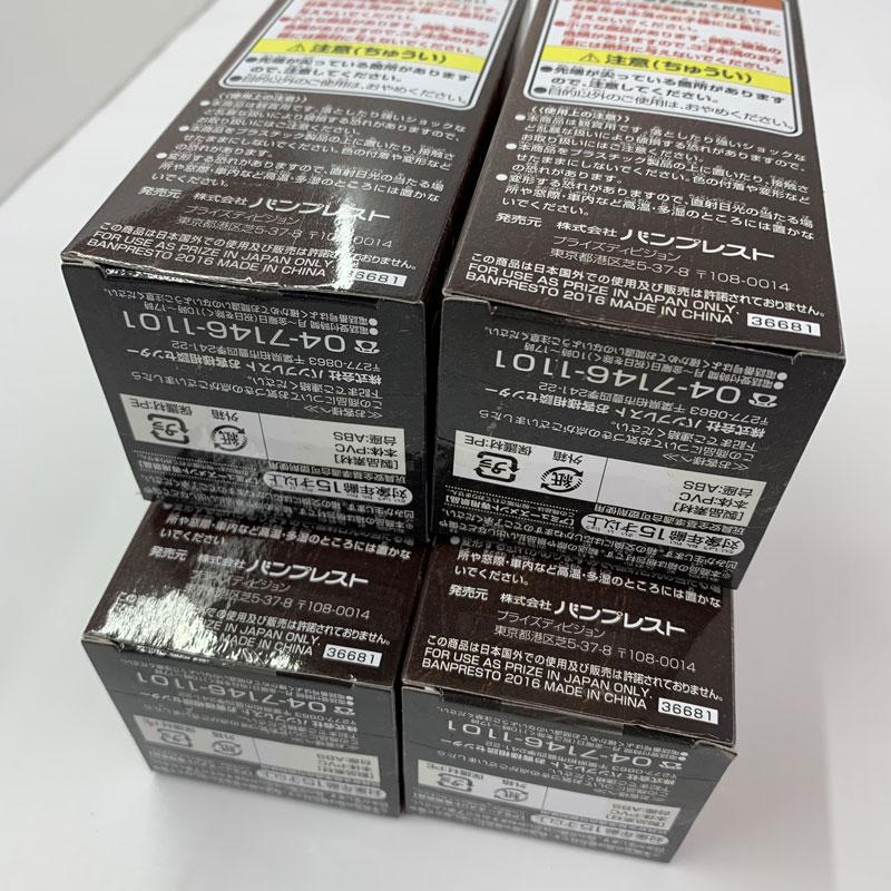 いずれも未開封品ですが、アミューズメント商品なのでアーム爪跡、落とし痕、テープの多重貼りや、メーカー検品による二度貼り、版権シールのズレや一部剥がれ等が見られる場合があります。美品をお求めの方、キズや汚れ等の状態を気にされる方のご購入はご遠慮下さい。箱にヤケが見られるものがあります。国内正規品。対象年齢 15歳以上。