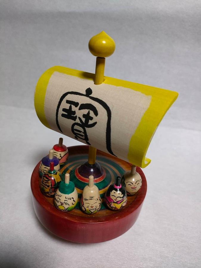 【商品の説明】日本では古来より「幸福は海の果てから来る」と考えられていました。こちらは宝物を積み込んだ帆船に七福神が乗っています。船と七福神はそれぞれ独楽で出来ています。